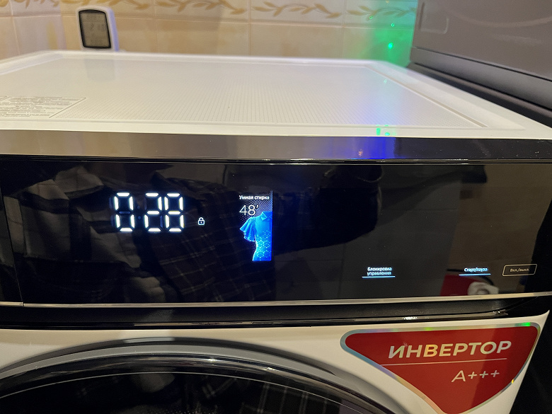 В качестве первого знакомства с машиной использовали основную программу для стирки хлопка с настройками по умолчанию — «Умная» на 48 минут.