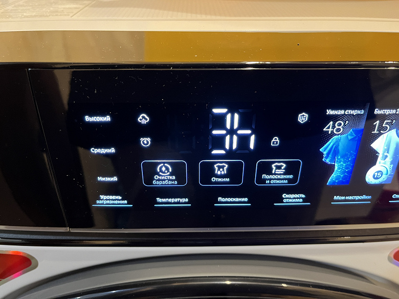 В левой части панели, между отсеком для моющих средств и сенсорными клавишами, расположен небольшой цифровой экран, на котором отображается ожидаемое время работы. Справа и слева от него предусмотрены индикаторы дополнительных опций.