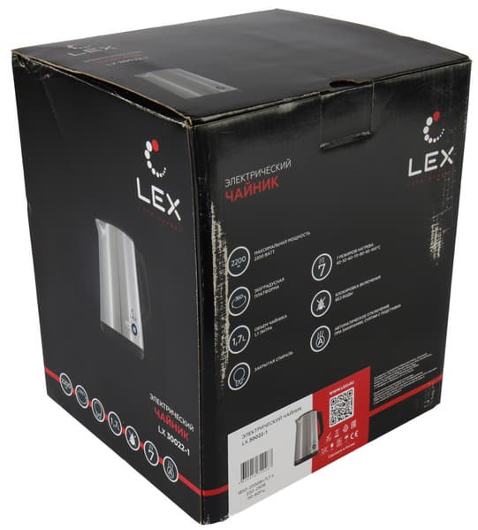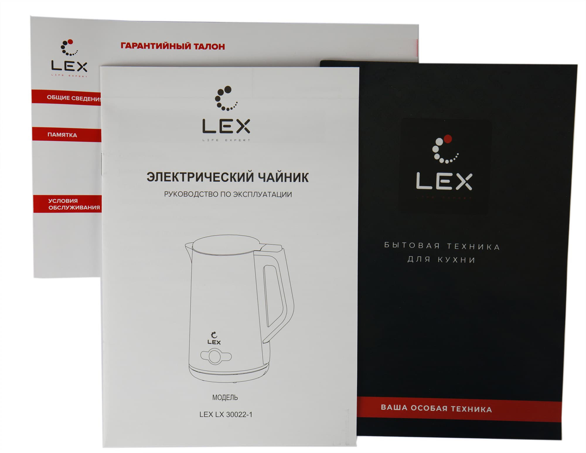 В комплект поставки Lex LX 30022-1 входит сам чайник, база устройства, руководство пользователя, гарантийный талон и рекламный буклет, рассказывающий о разнообразии бытовой техники этого производителя.