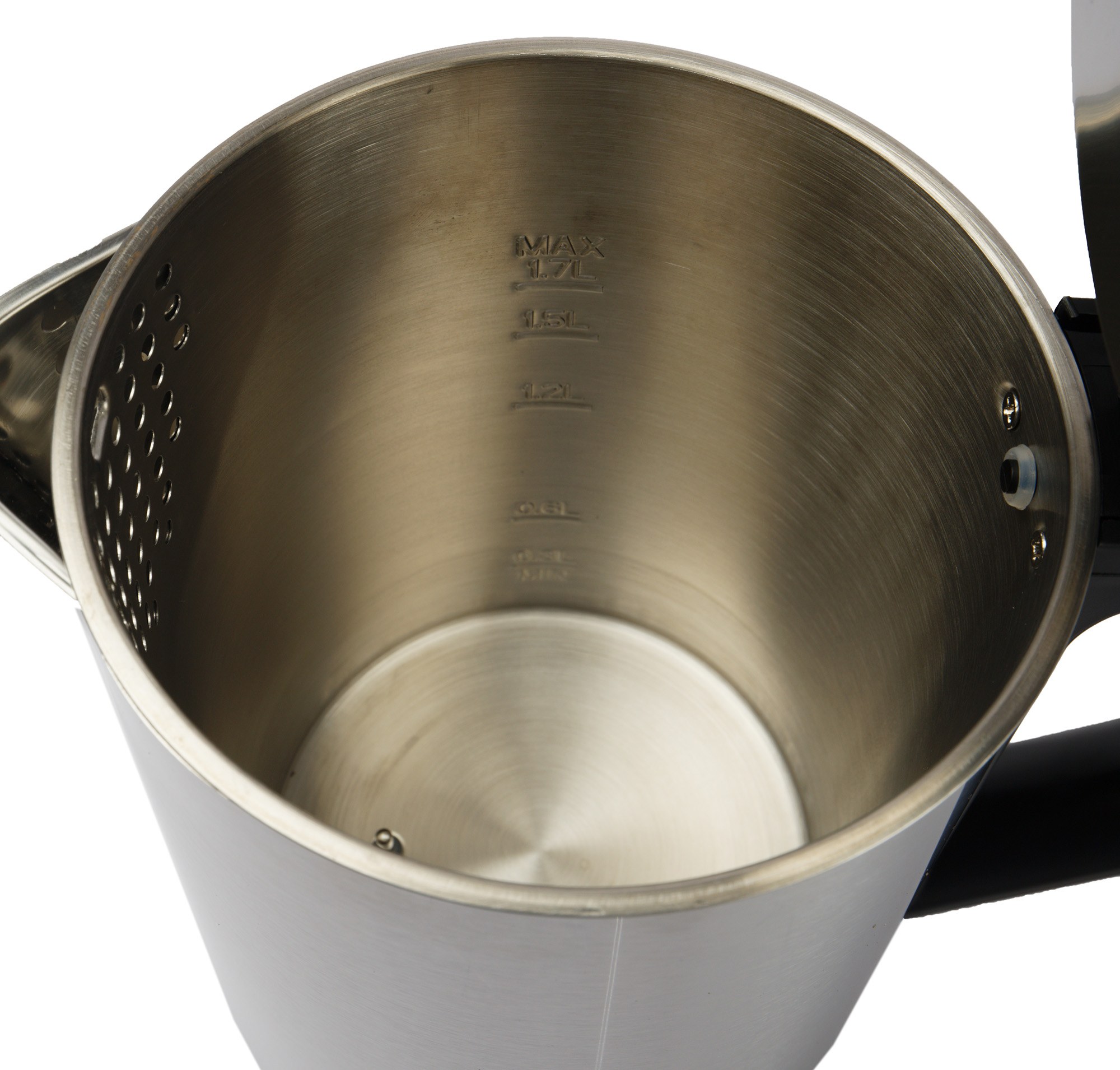 У двухслойного корпуса снаружи нет индикатора уровня воды. Риски, обозначающие объем, выдавлены на внутренней стороне емкости. Отмечены уровни 0,2, 0,6, 1,2, 1,5 и 1,7 литра. Дно чайника гладкое, нагревательный элемент — скрытого типа. Над поверхностью выступает датчик температуры.