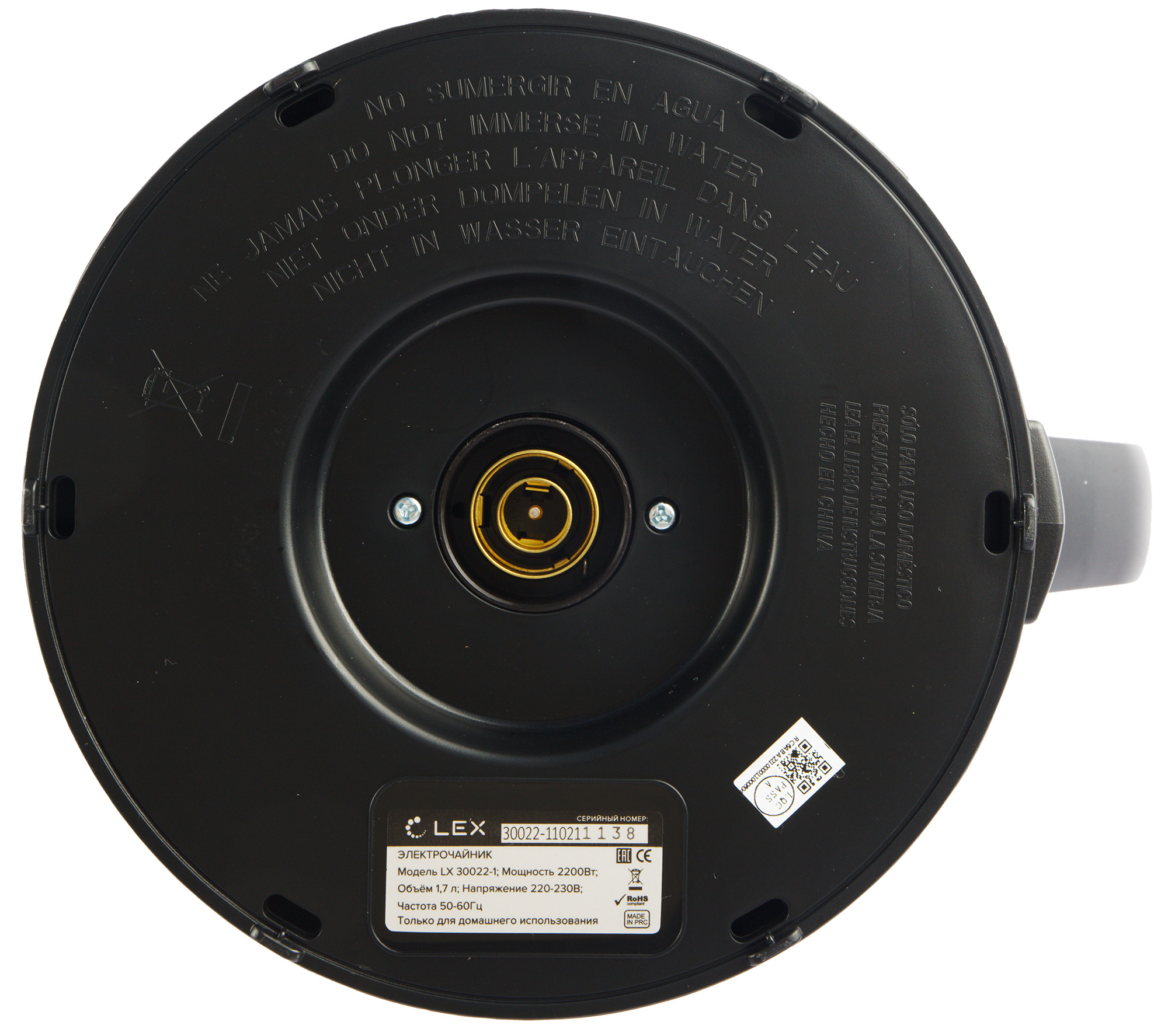У разъема питания три контакта: вся управляющая схема находится в корпусе чайника, а база нужна только для подключения электричества. На дне закреплен традиционный шильдик с серийным номером, краткими техническими характеристиками и информацией о сертификации.