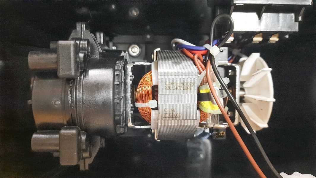 По традиции, мы разобрали моторный блок мясорубки, чтобы посмотреть, как выглядит механизм изнутри. Под пластиковым корпусом расположены моторный блок с редуктором и плата управляющей электроники.