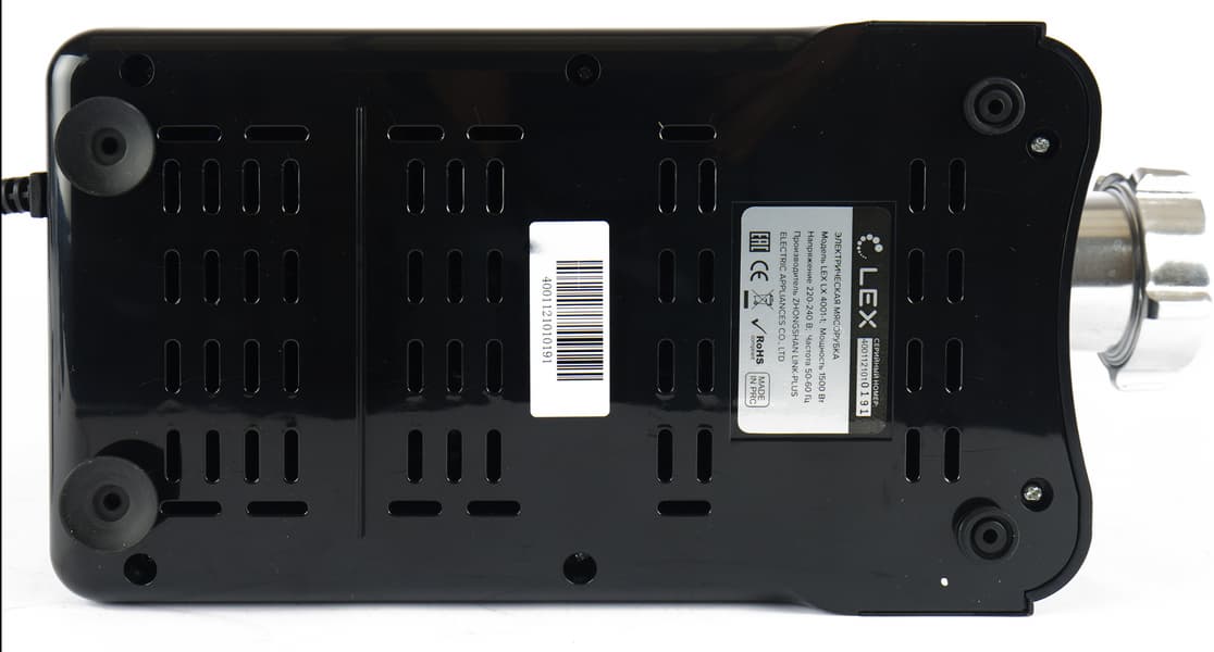 Снизу располагаются вентиляционные отверстия, наклейка с номером модели и технической информацией. Прибор оснащен парой обычных резиновых ножек и парой ножек-присосок, для прочного сцепления с поверхностью стола.