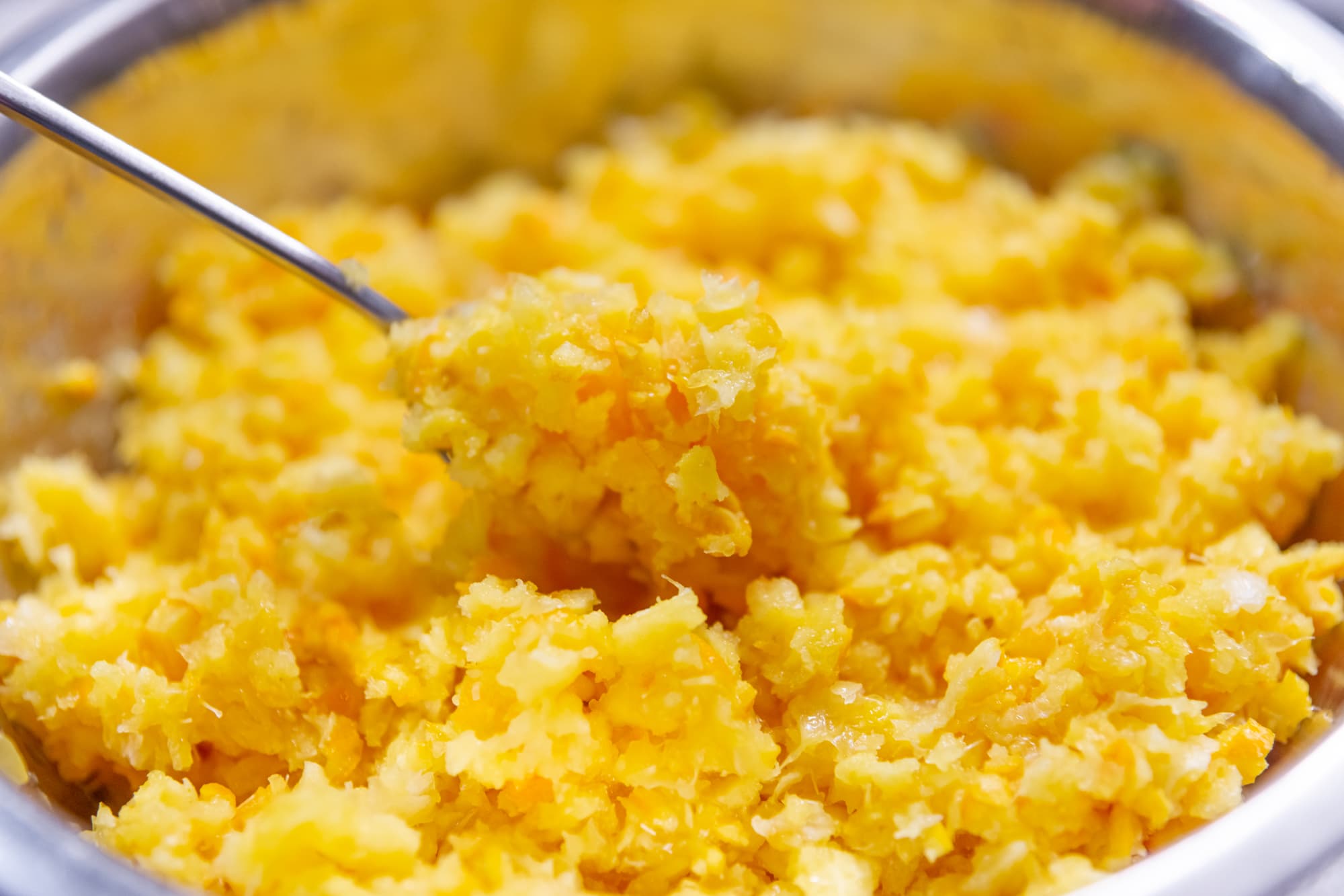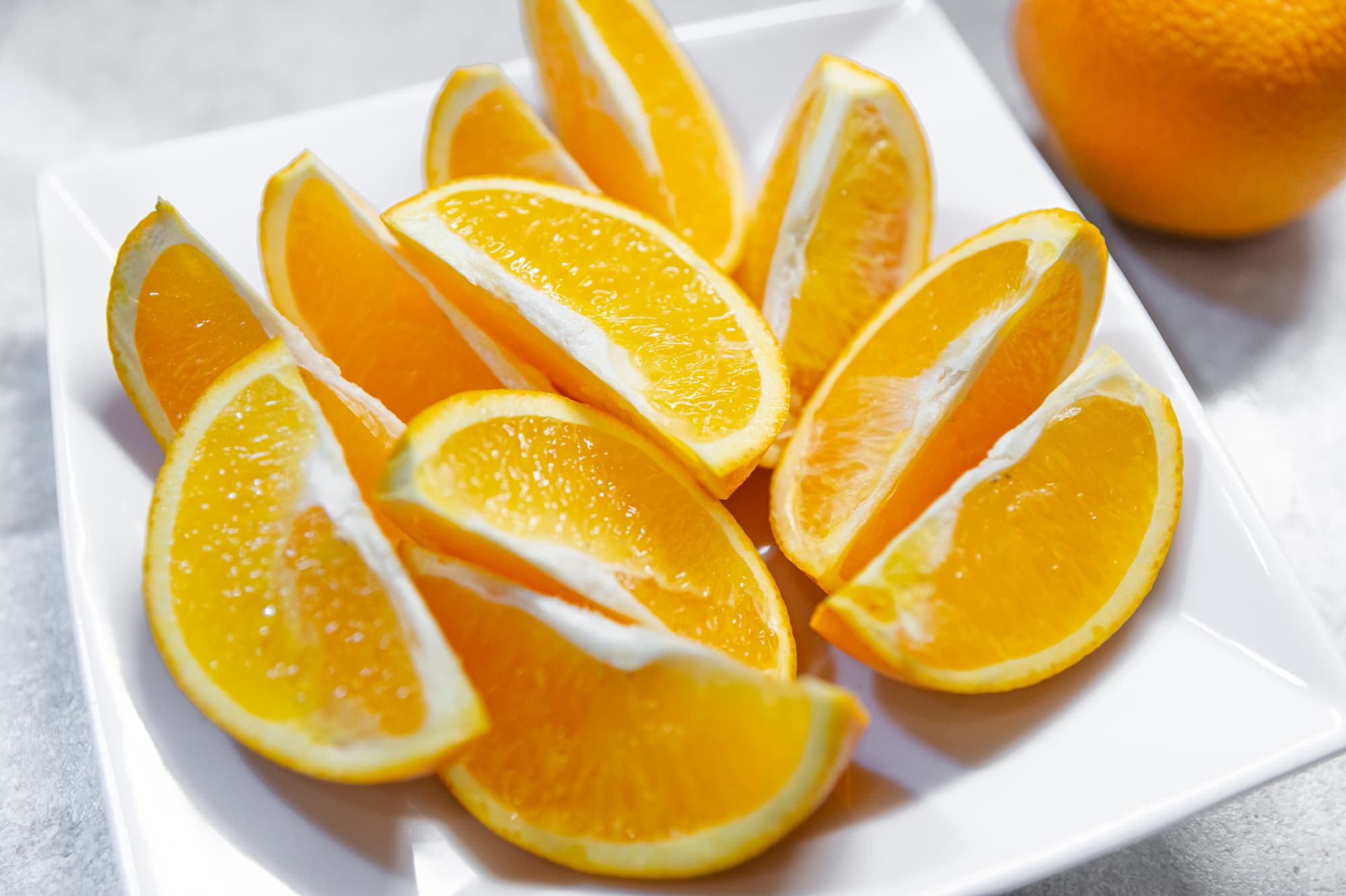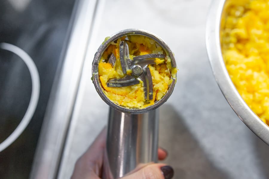 Апельсины были нарезаны на шесть частей вместе с кожурой и перемолоты в мясорубке на крупной решетке.