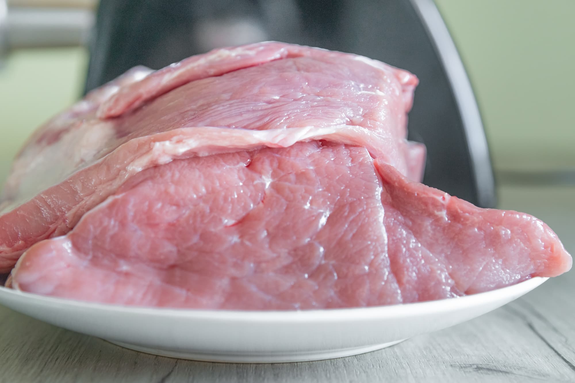 Для первого, классического теста мы использовали свиной окорок, не подвергавшийся заморозке, очищенный от пленок и жира, прокрутив его через решетку с большими отверстиями. Мясо было нарезано на длинные куски достаточной ширины для прохождения через горловину мясорубки.