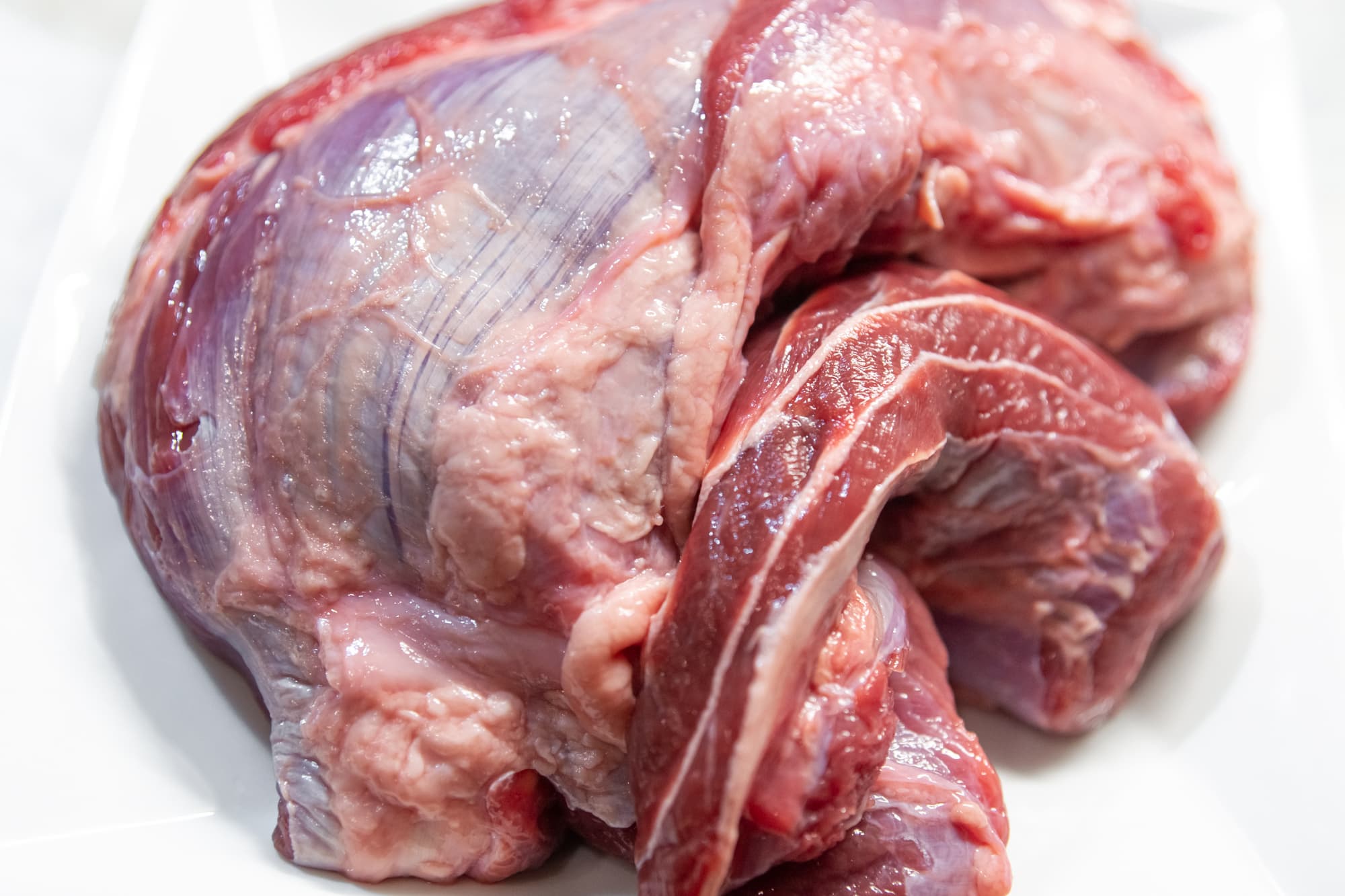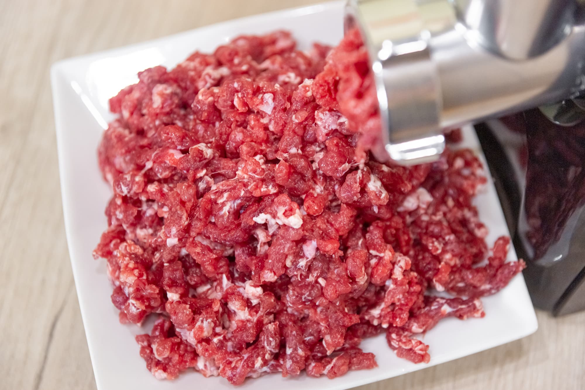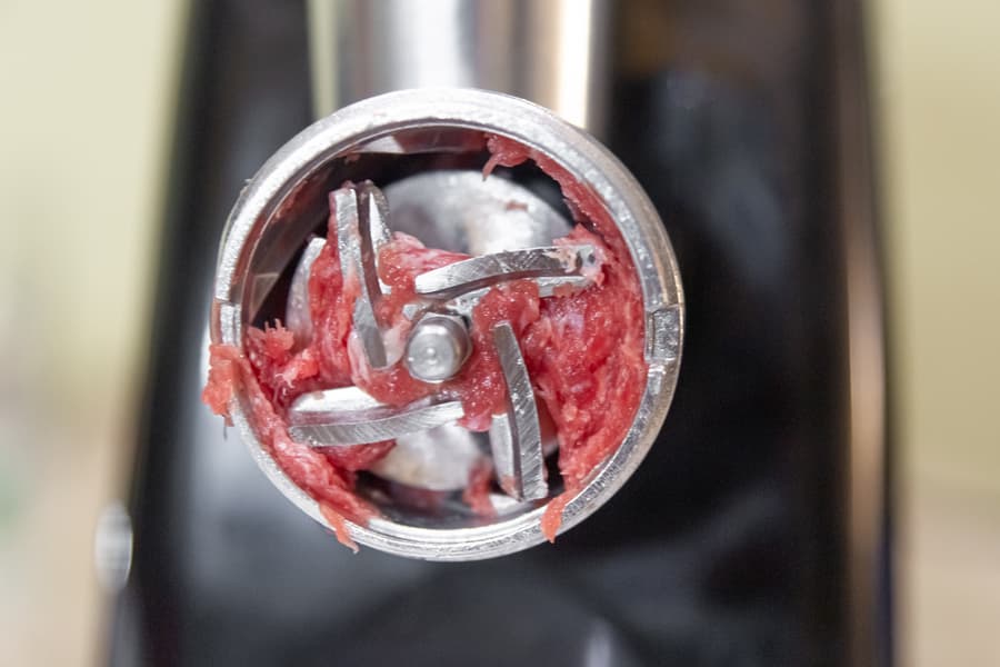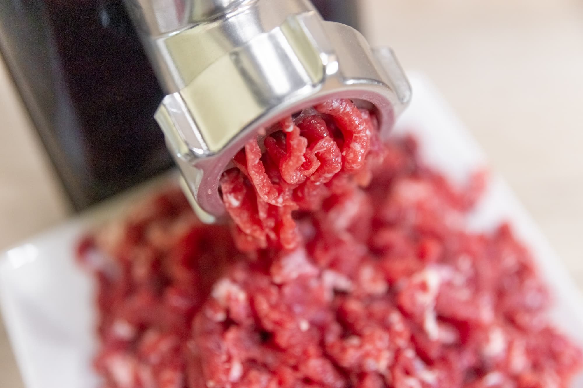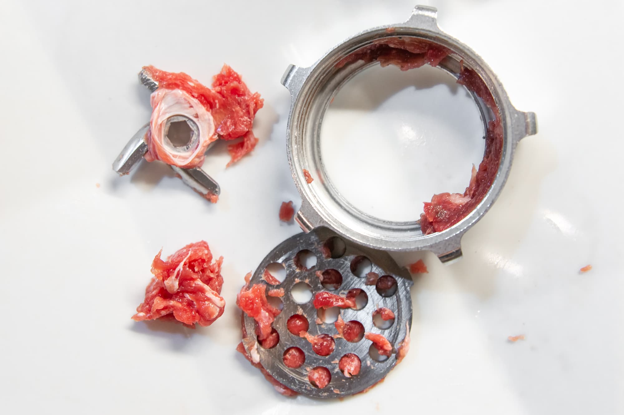 Для следующего теста со звездочкой мы использовали жилистую говядину третьего сорта, с большим количеством пленок и жилок. Мы срезали крупные сухожилия и пленки и нарезали мясо на куски, свободно проходящие в горловину мясорубки. Как и в прошлом тесте, мы использовали крупную решетку.