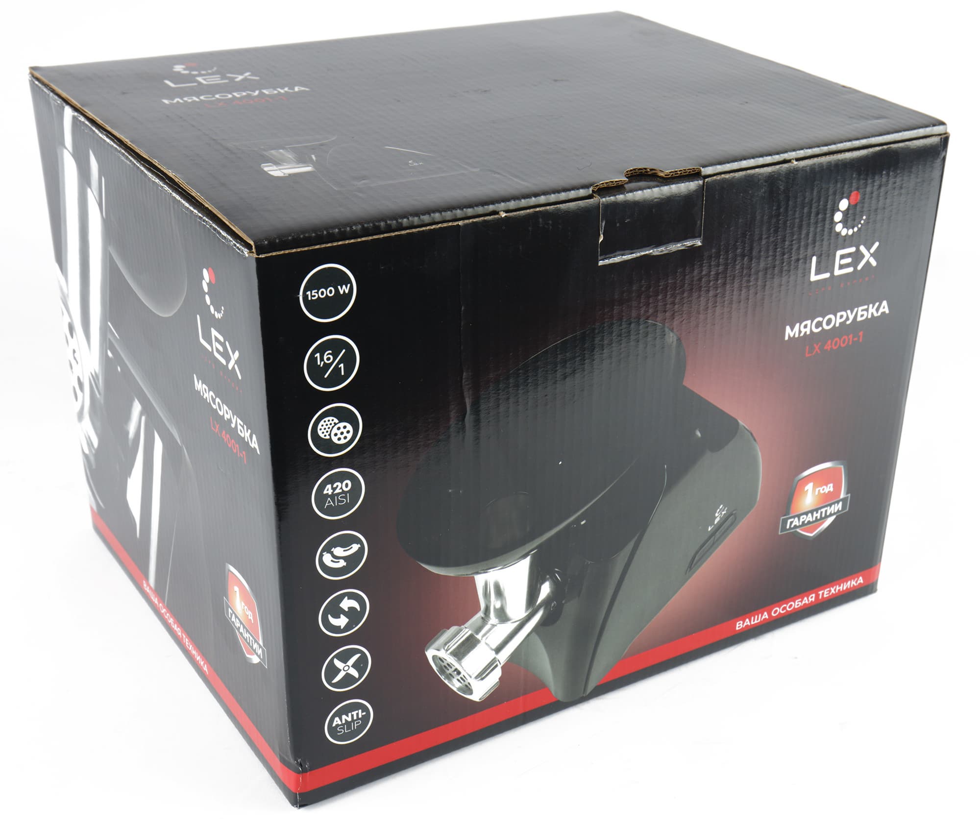 Мясорубка Lex LX-4001-1 поставляется в картонной коробке небольшого размера с цветной глянцевой печатью. На черном фоне упаковки изображен прибор в полной комплектации, логотип компании, а также эмблема с указанием срока гарантии и пиктограммы ключевых характеристик устройства. Повернув коробку обратной стороной, мы видим их расшифровку, штрих код изделия и QR-код для посещения сайта компании, где можно ознакомиться с подробным описанием прибора.