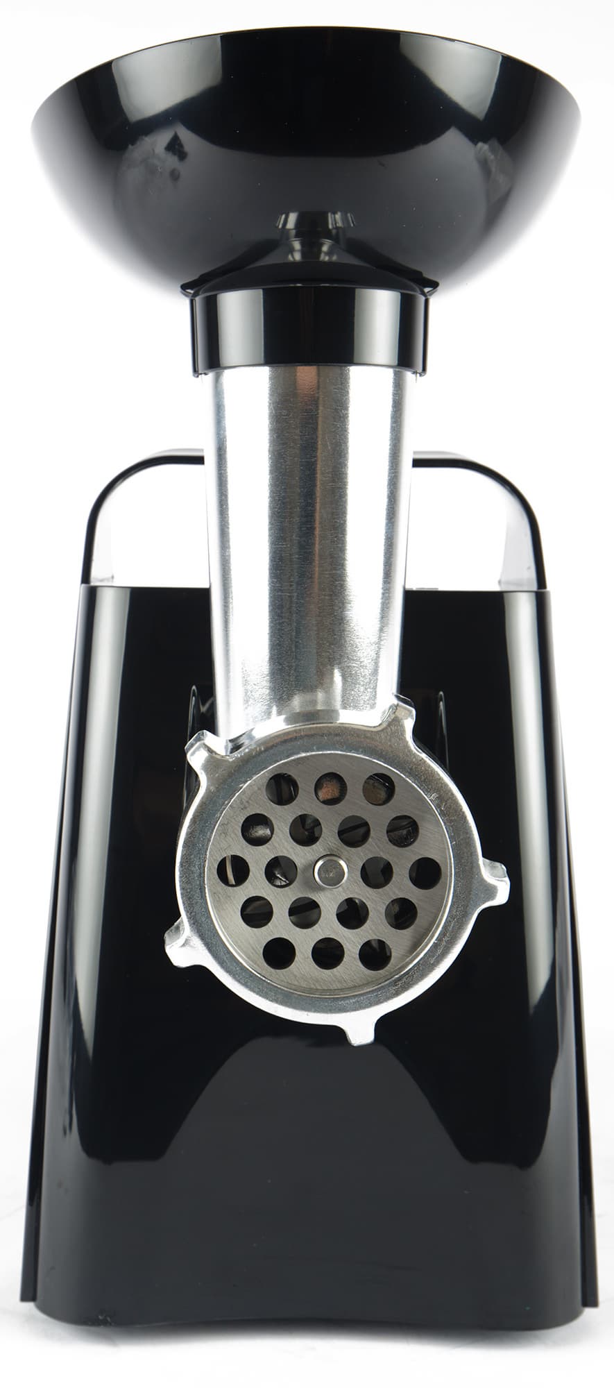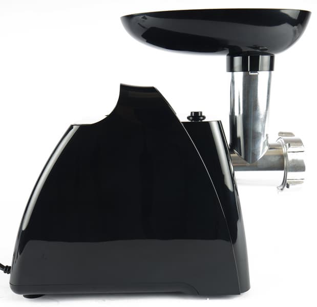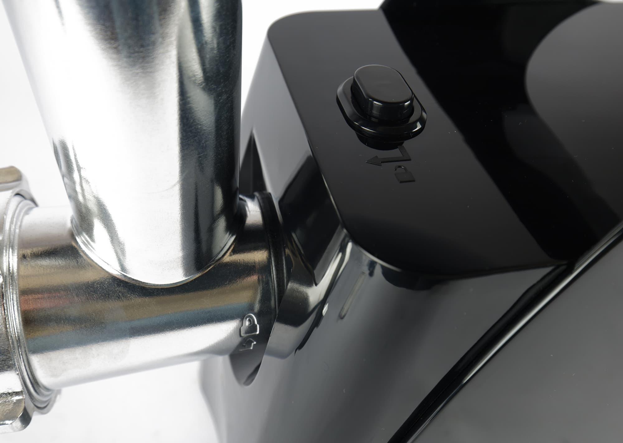 В верхней части корпуса находится удобная ручка для переноски. На правой стороне расположен блок управления, состоящий из двух крупных механических кнопок: «On/Off» и «Rev», с помощью которых осуществляется включение и выключение прибора, а также запуск обратного вращения. Мясорубка имеет только одну скорость.