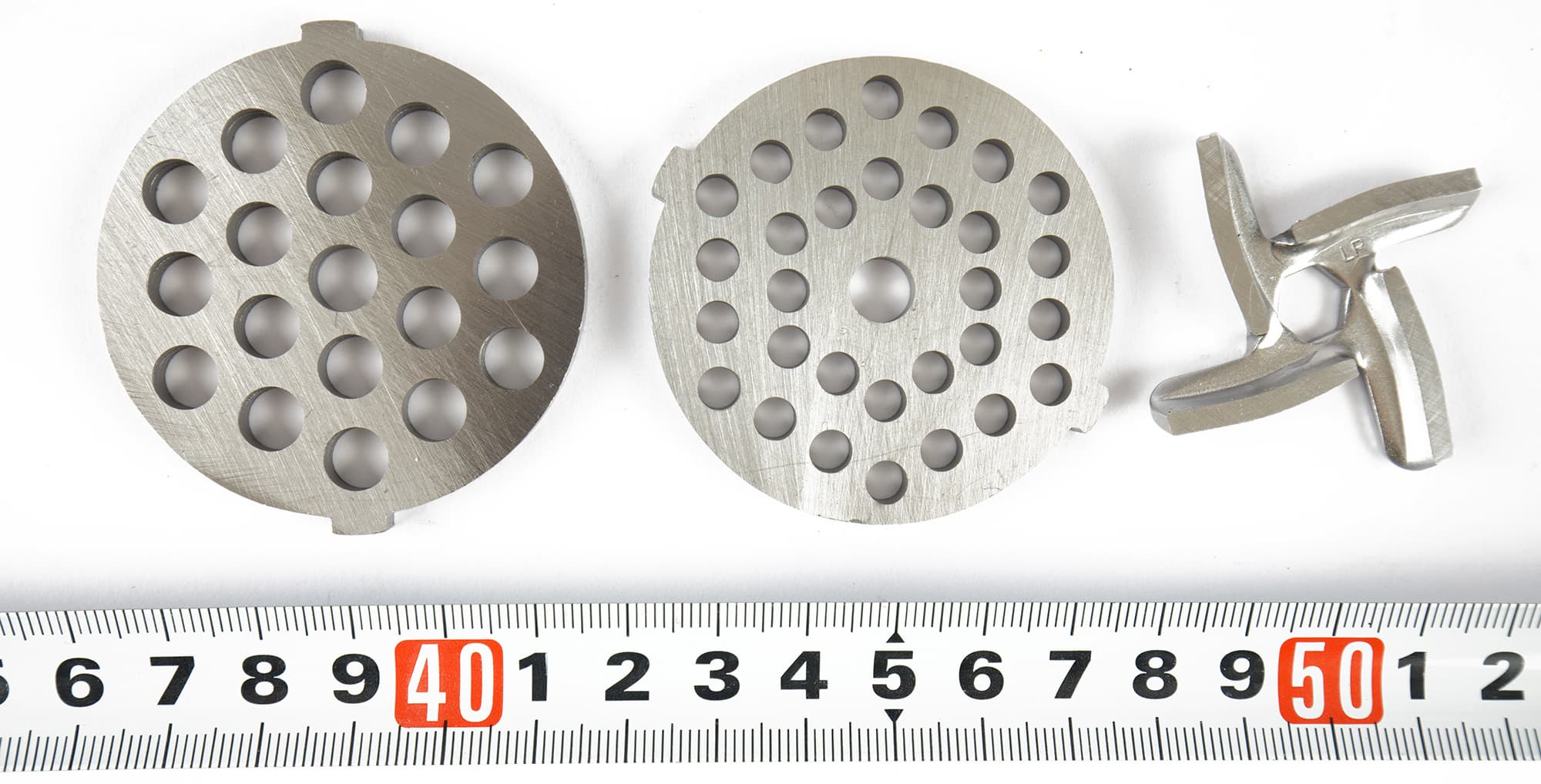 Две перфорированные решетки позволят получить фарш желаемой степени измельчения. Толщина решеток — 4 мм. Диаметр отверстий на дисках соответствует значениям в 5 и 7 мм. Никаких претензий к качеству металлических деталей у нас не возникло.