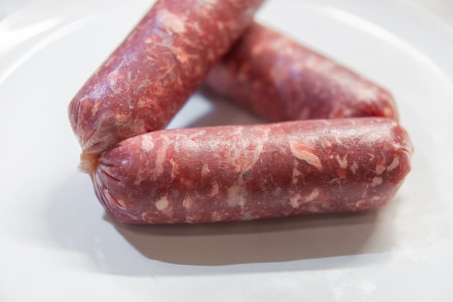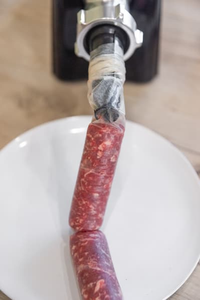 Для изготовления домашних колбас мы взяли говяжий фарш из второго теста, добавили пряности и соль, присоединили к мясорубке насадку для набивки колбасок и натянули на нее специальную оболочку.