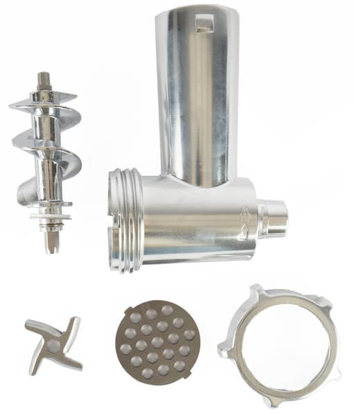 Горловина и зажимная гайка у нашей мясорубки металлические (алюминиевые). Ножи и формовочные диски — стальные.