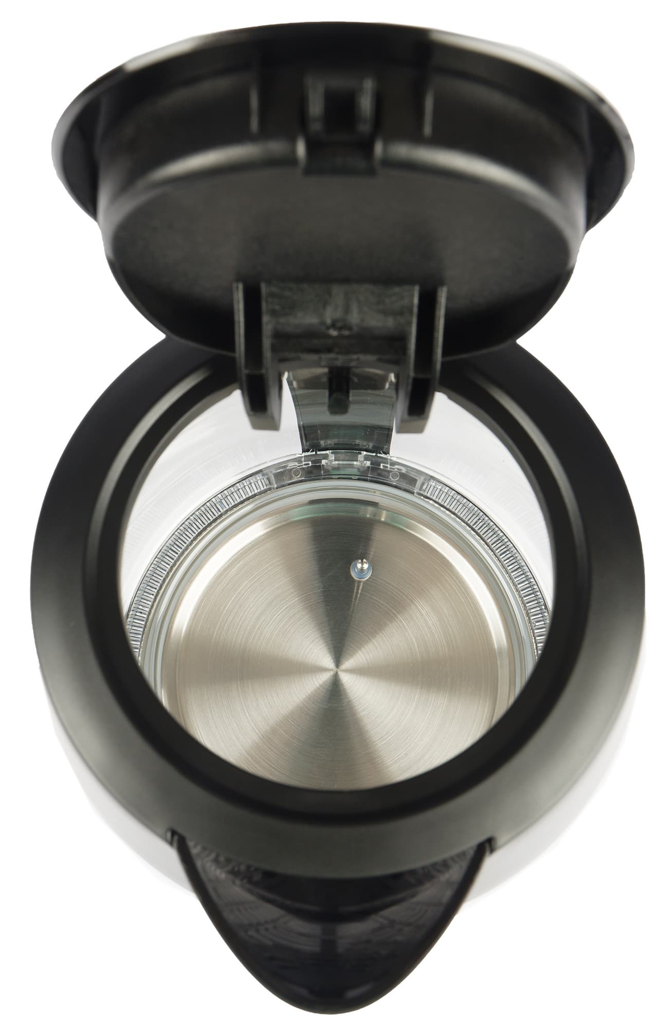 Колба чайника из жаропрочного стекла, а верхняя и нижняя части корпуса отделаны серебристым металлом. Из него же и верхняя часть крышки, а D-образная ручка изготовлена из черного матового пластика.