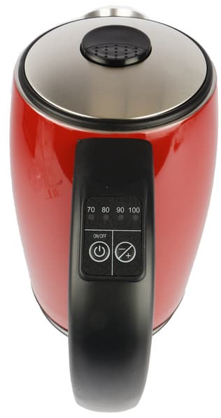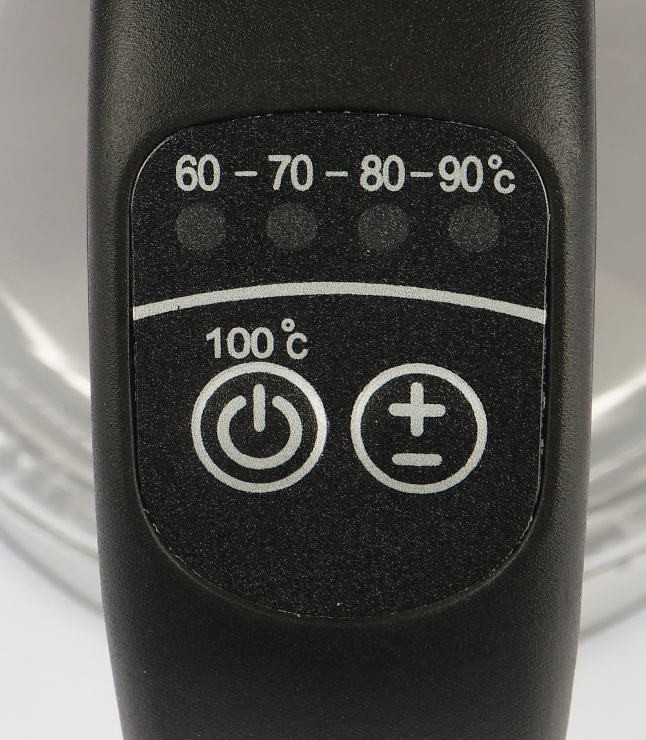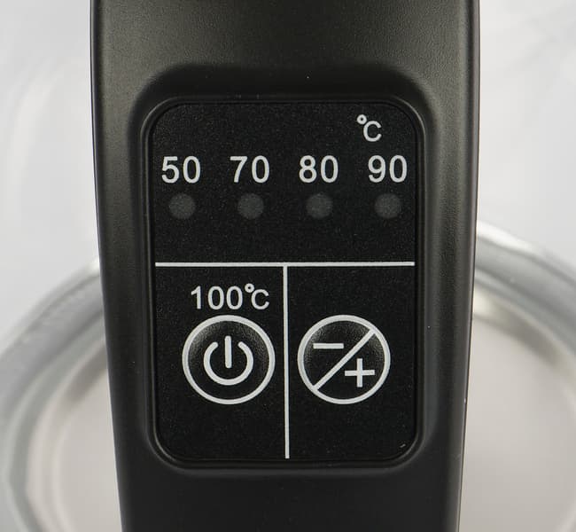 Первая кнопка включает чайник в режиме кипячения, а последовательными нажатиями на вторую можно выбрать нужную температуру подогрева: 60, 70, 80 или 90 °C.