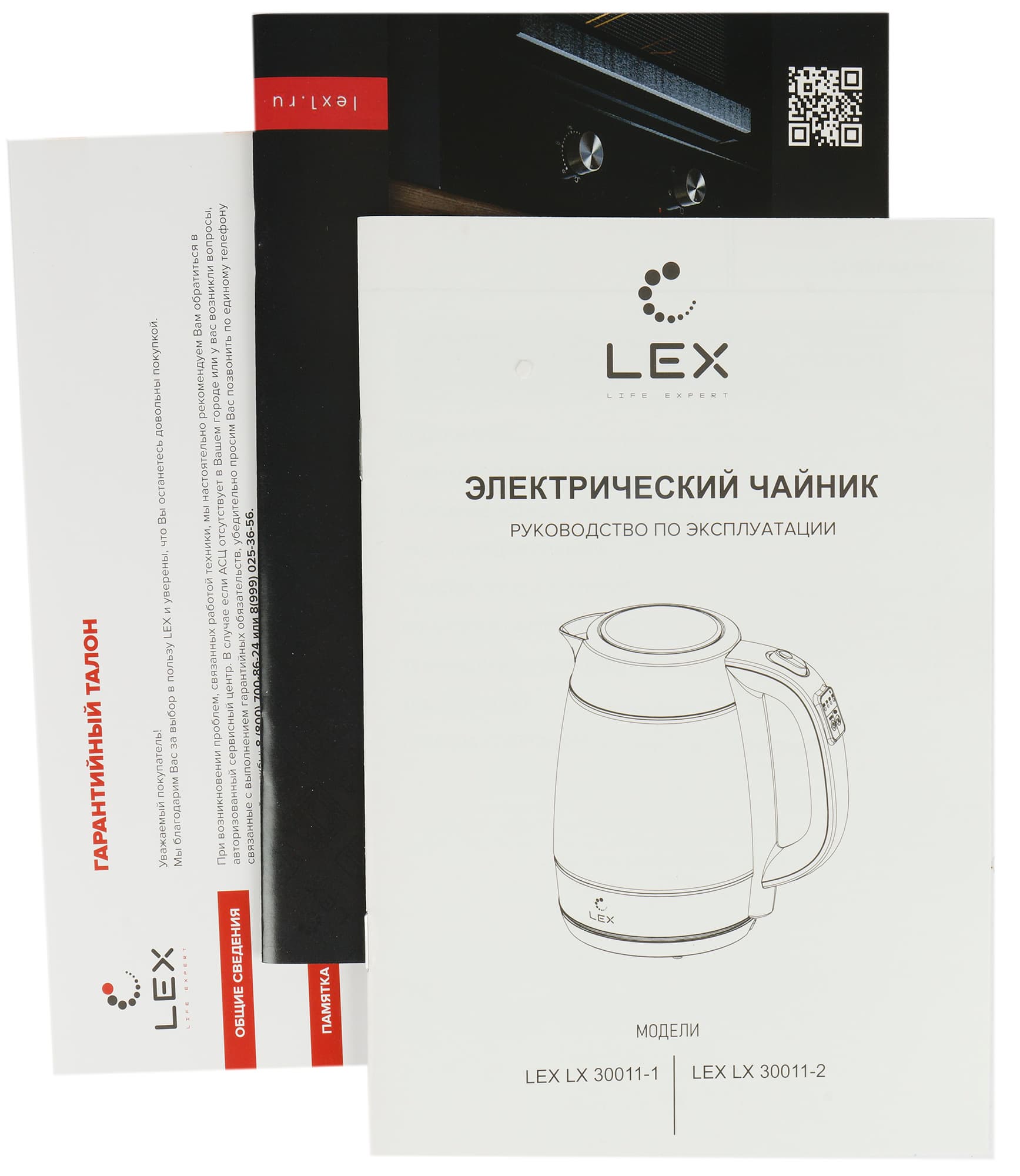 В коробке мы обнаружили сам чайник, базу, руководство пользователя, гарантийный талон и буклет с информацией о новинках бытовой техники Lex.