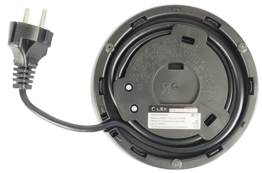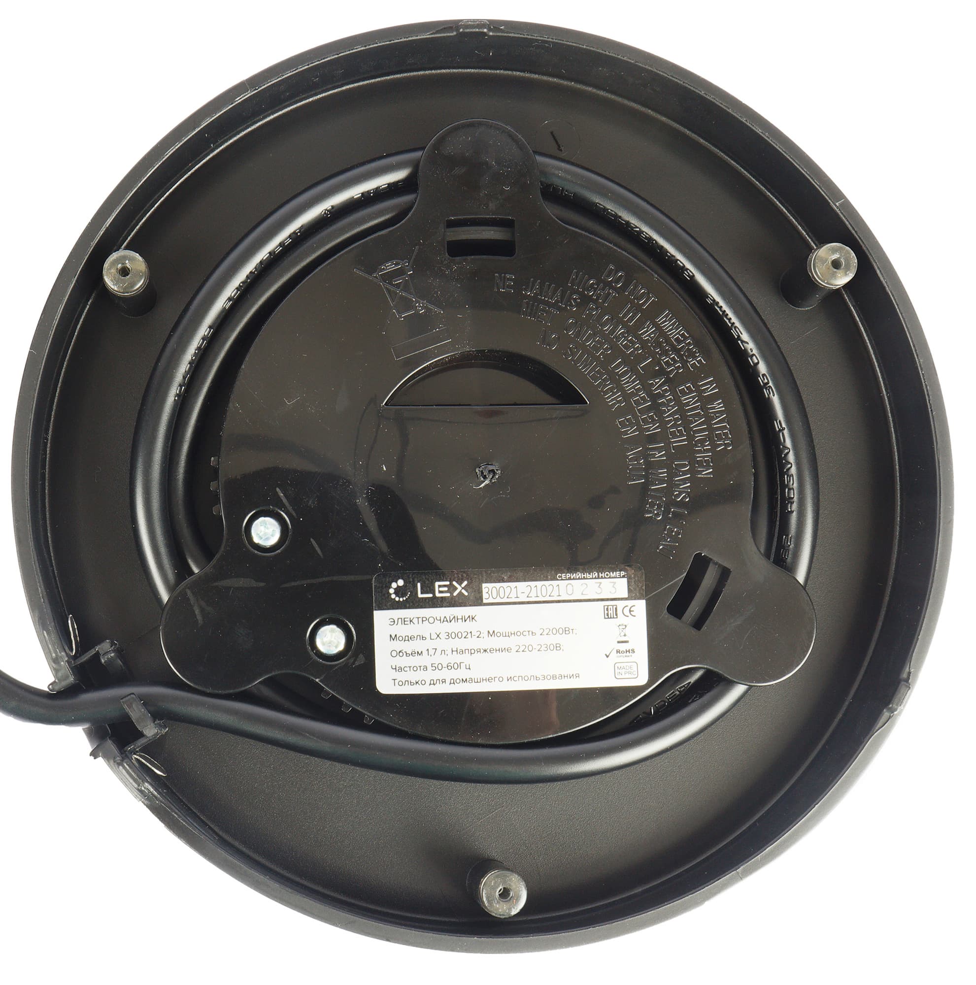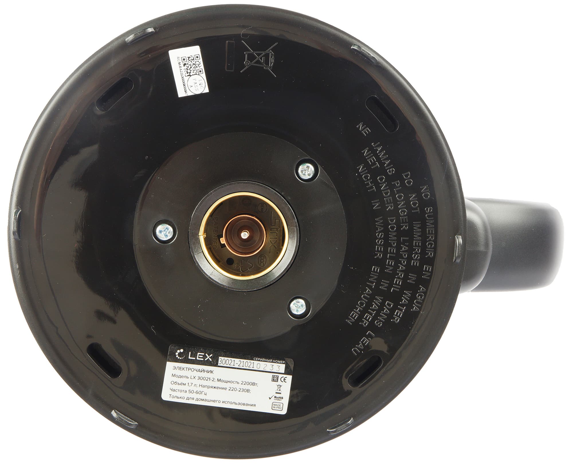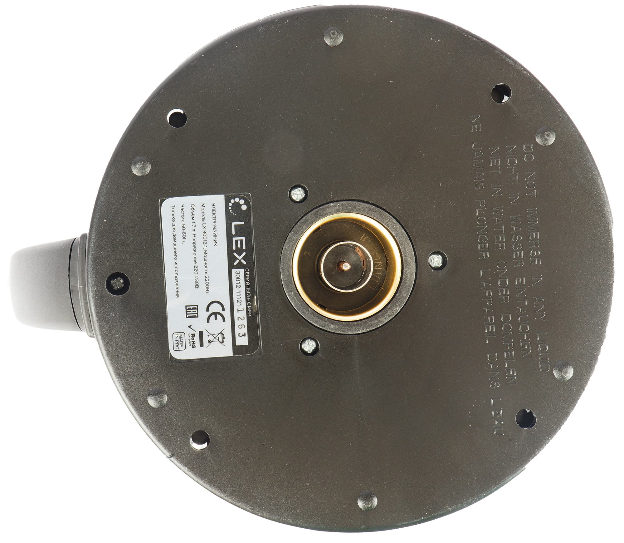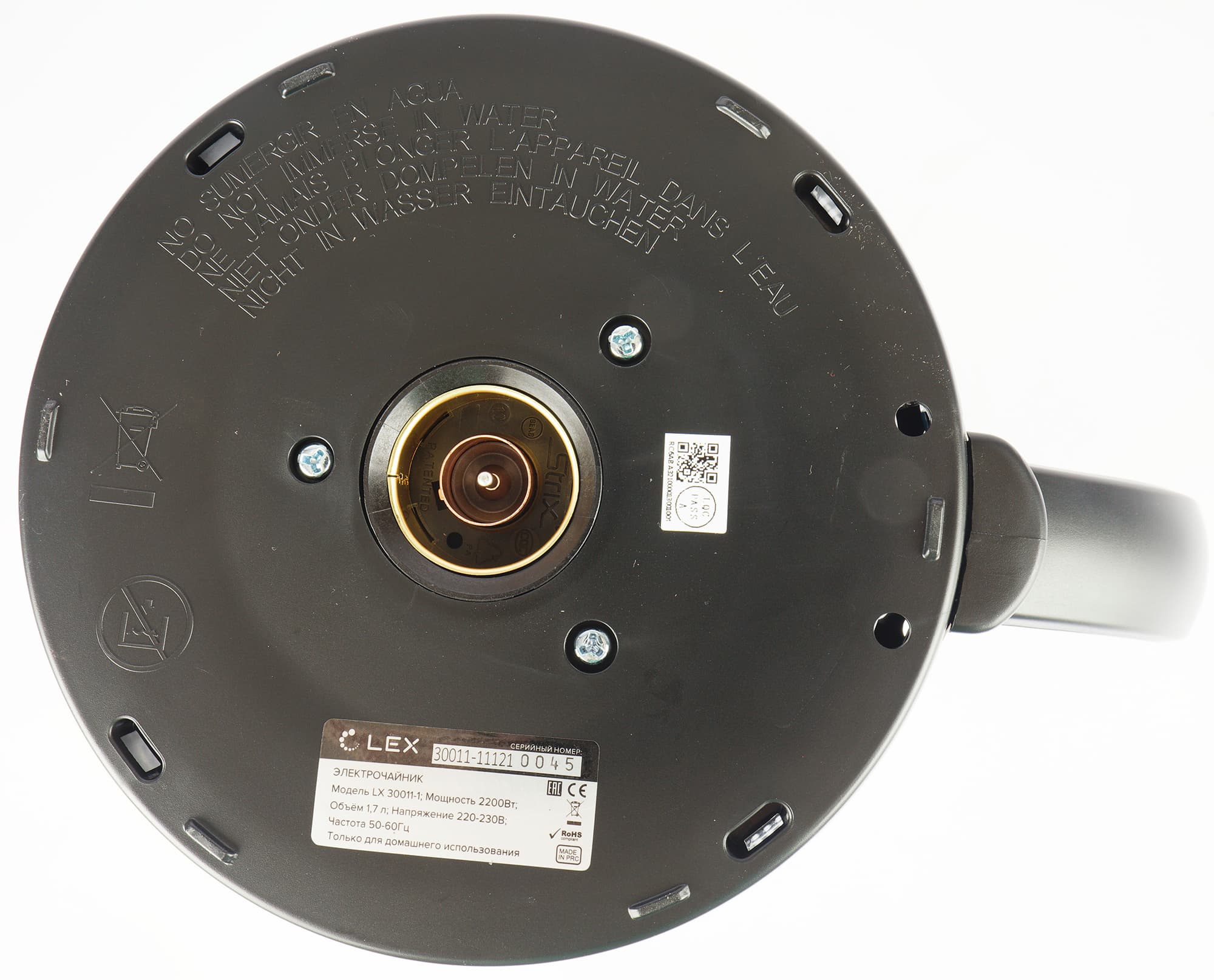 Как и у большинства современных чайников, нагревательный элемент у LX30012-1 скрытого типа, дно гладкое. Над ним возвышается только металлический колпачок термодатчика, а по периметру проходит полоса RGB-светодиодов, отвечающих за подсветку корпуса.