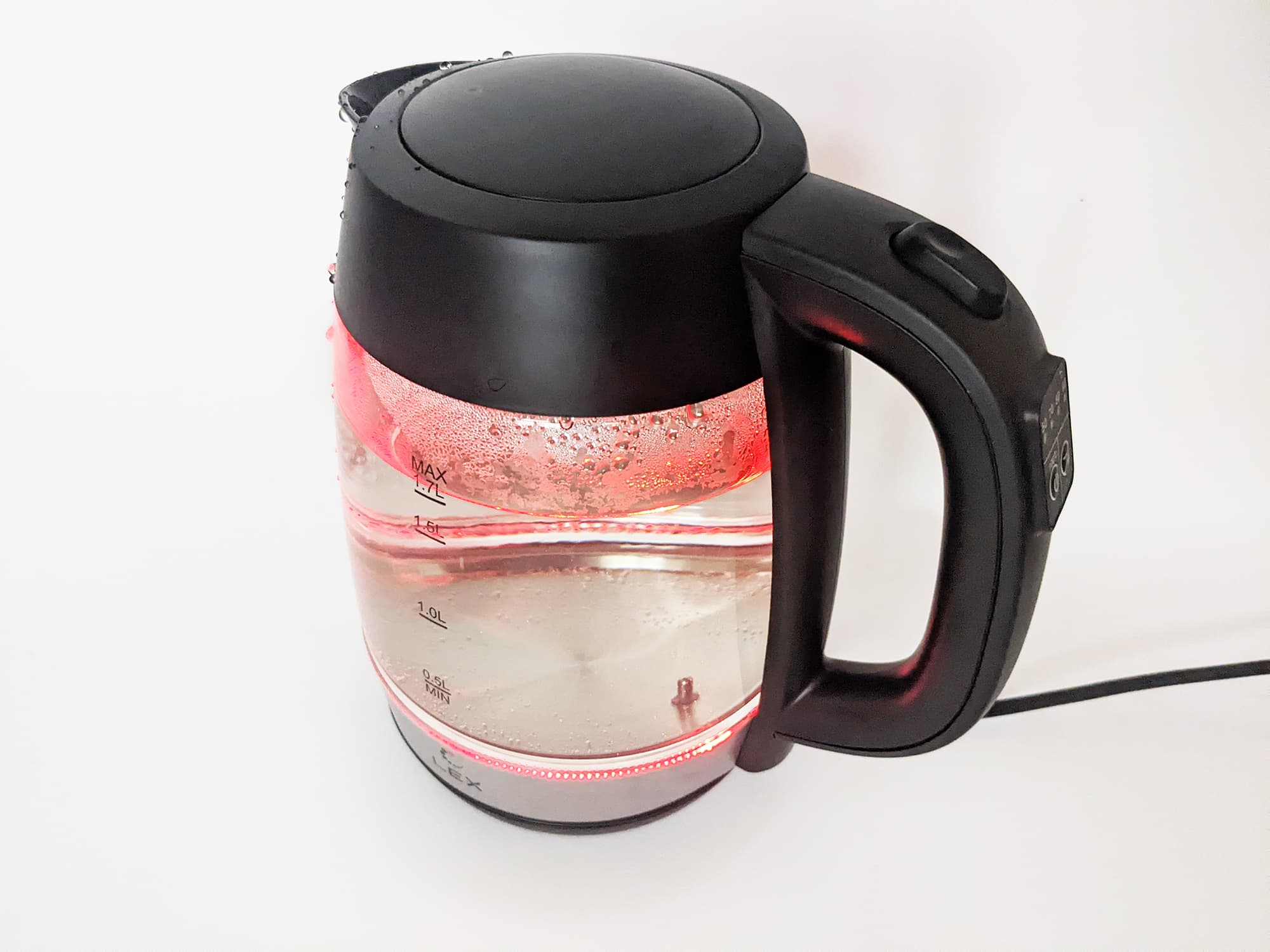 Светодиодная подсветка меняет цвет в зависимости от выбранного режима: зеленый свет сопровождает подогрев до 50 °C, синий, фиолетовый и голубой включаются при нагреве до 70, 80 и 90 °C соответственно, а в режиме кипячения чайник светится красным.