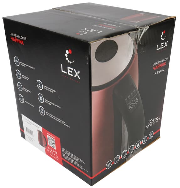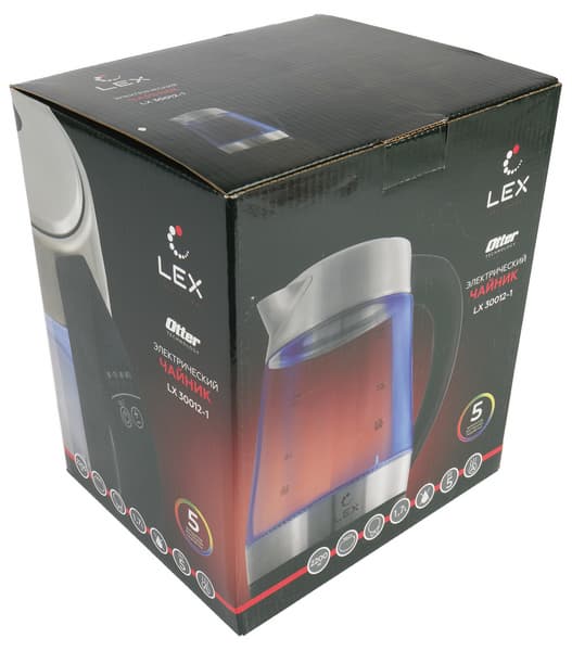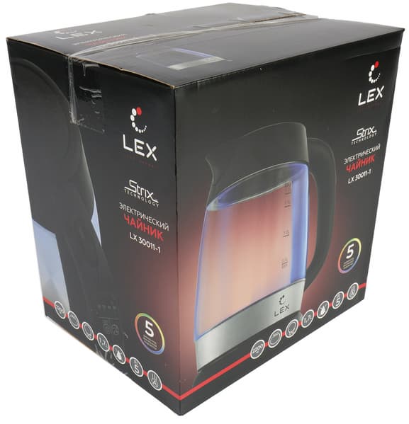 Упаковка этой модели также украшена цветной фотографией чайника на черном фоне, а иконки в нижней части лицевой стороны обращают внимание покупателя на основные особенности модели. Они почти ничем не отличаются от описания предыдущей модели — только светодиодной подсветки у LX30021-2 нет, а режимов нагрева четыре, а не пять.