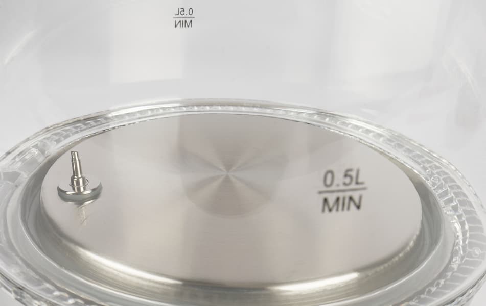 Метки объема нанесены на боковые стороны колбы с двух сторон. Между минимальным (0,5 л) и максимальным уровнями нанесена также отметка 1 л.