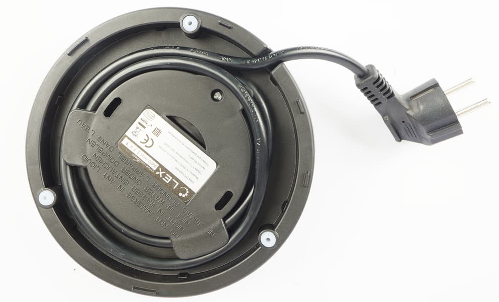 Если чайник стоит близко к розетке, то излишек провода можно убрать внутрь подставки: отсек в нижней части вмещает два витка провода.