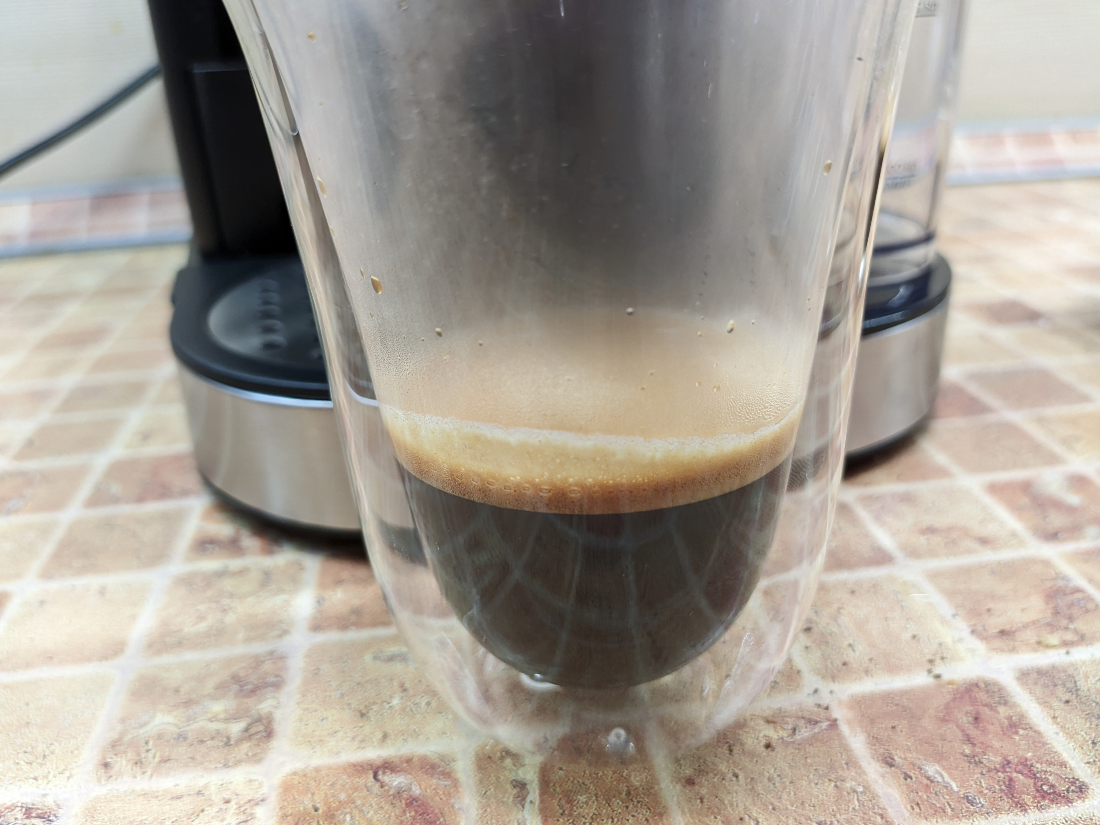 Уменьшив помол, нам удалось добиться получения 30 г напитка за 20 секунд. Дальше приготовление можно остановить в любой подходящий момент (в соответствии с собственным вкусом) — результат будет лучший из возможных. По вкусу, по цвету и по пенке это очень похоже на настоящий двойной эспрессо. Температура готового напитка оказалась предсказуемо выше, чем у одинарного эспрессо. Она повысилась до 84 градусов.
