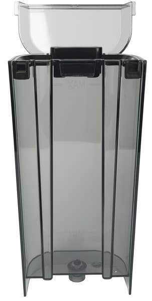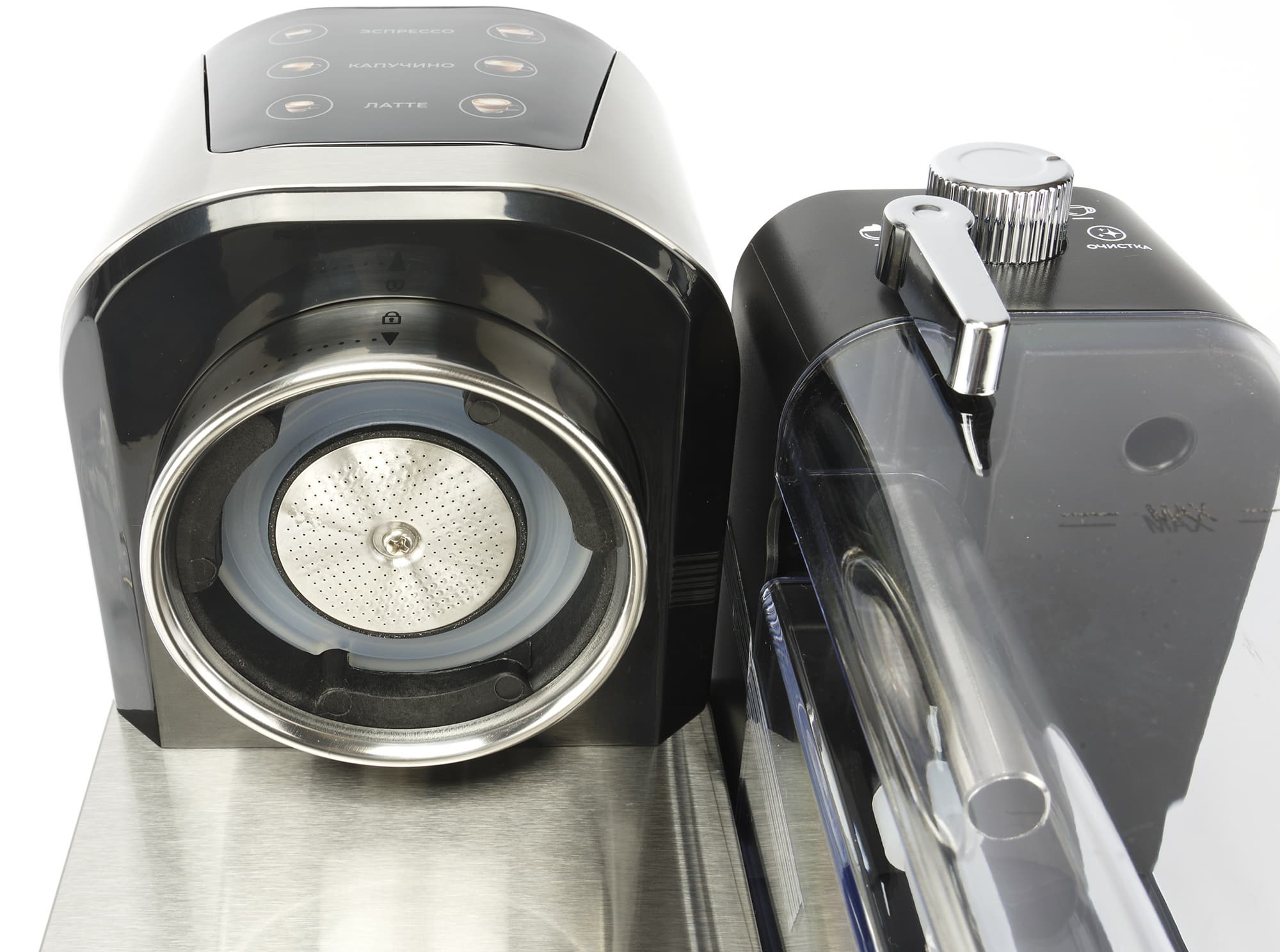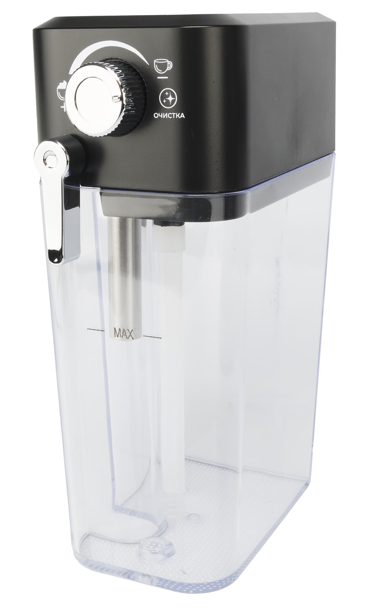 В резервуаре для молока расположены две трубки: металлическая — сопло парового шланга для выхода вспененного молока, и пластиковая — для забора молока. На крышке находится регулятор металлического сопла, который при повороте направляет молочную пену в чашку (а не на стол). Рядом видны настройки регулятора пены: для капучино, латте и режим очистки. Сам резервуар изготовлен из пластика и имеет отметку максимального уровня молока. В инструкции указано, что резервуары для воды и молока следует наполнять так, чтобы уровень жидкости находился между отметками Min и Max, однако на контейнере для молока отметку Min обнаружить не удалось.