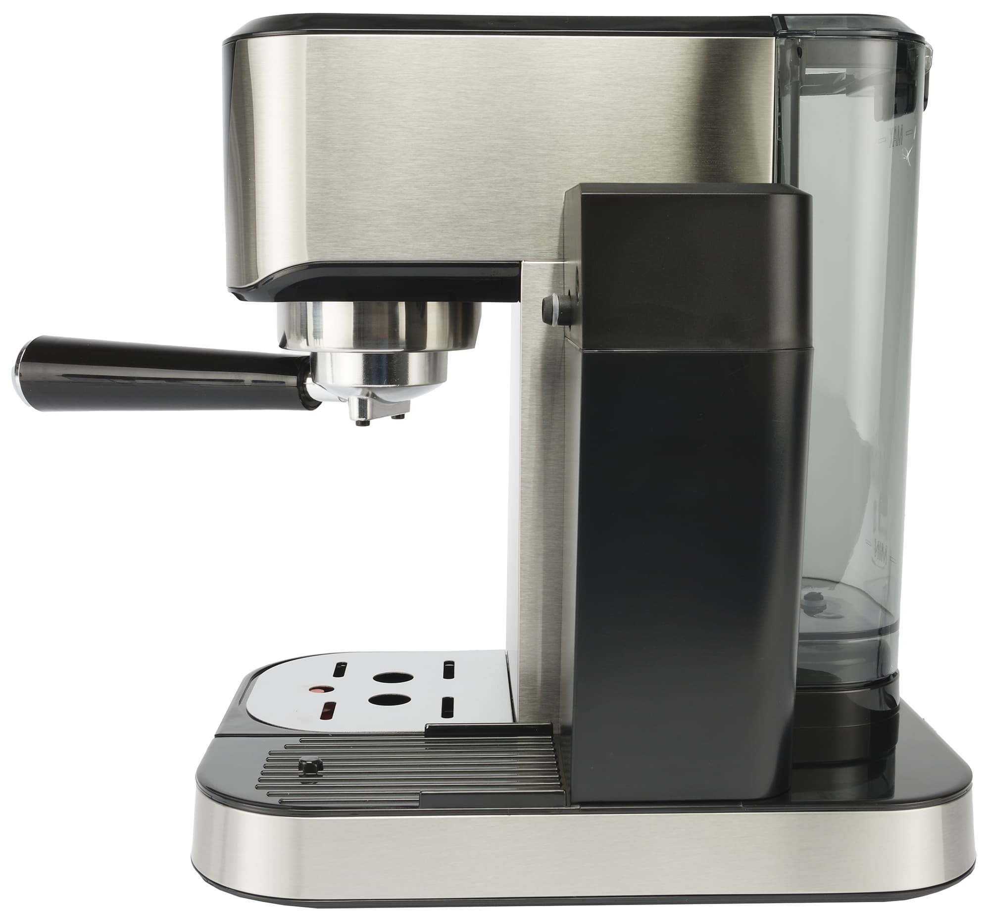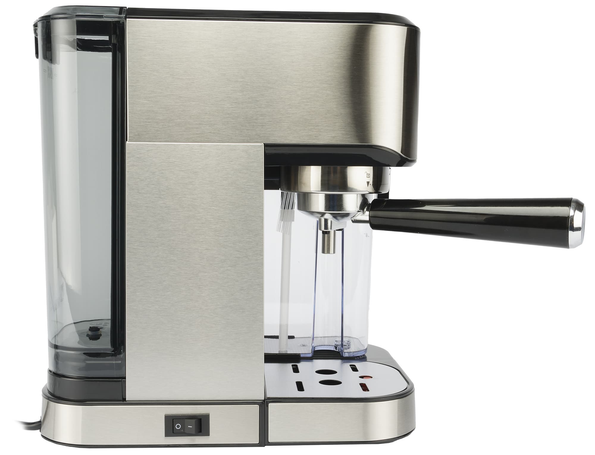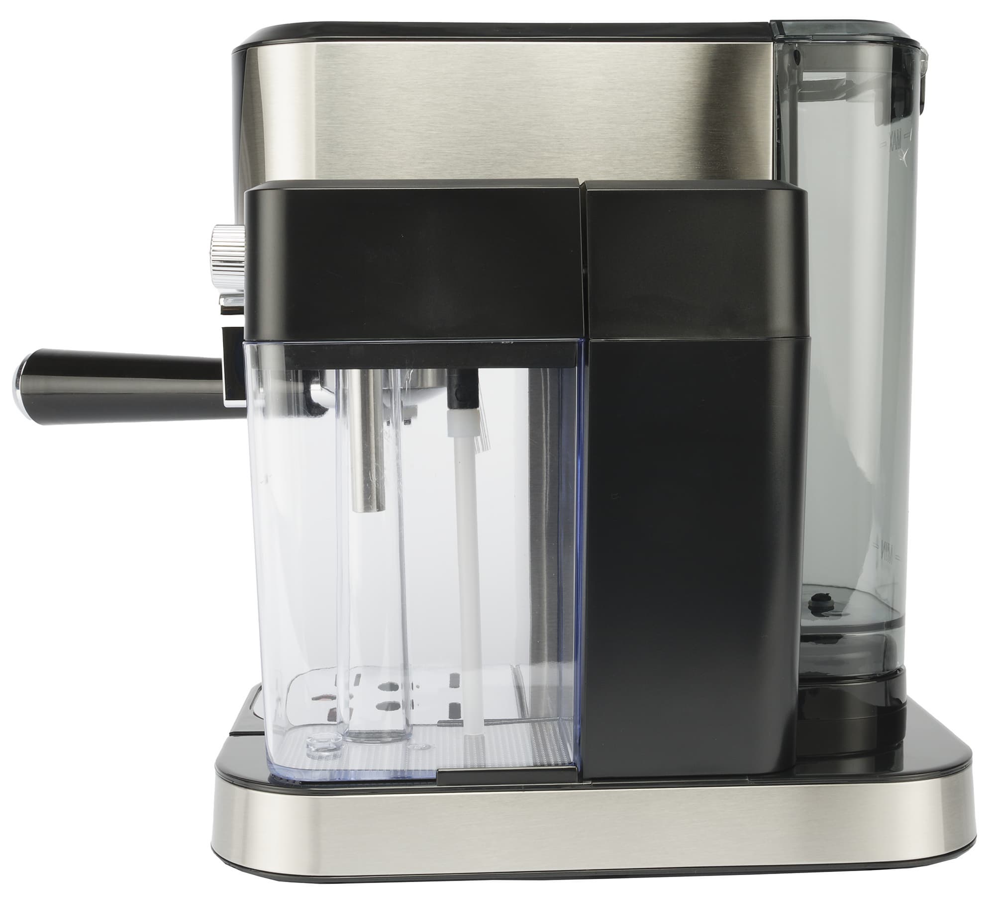 На фотографии правой боковой стороны кофеварки хорошо видны резервуар для молока и трубка его подачи.