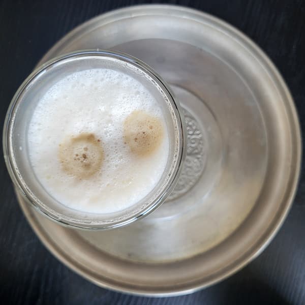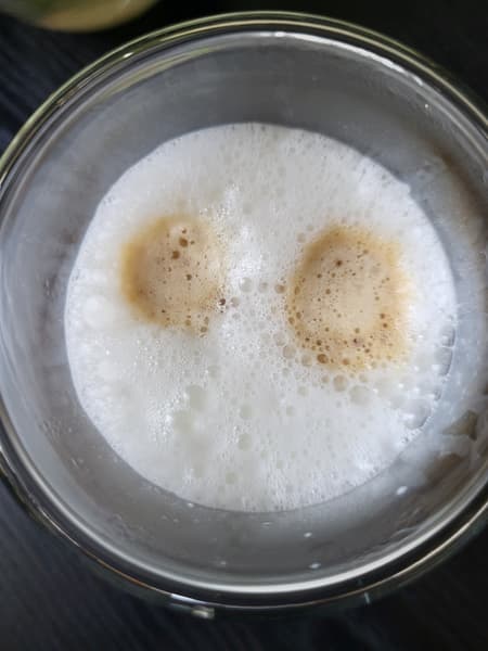 Производителем заявлена порция одинарного капучино 180 мл, но у нас стабильно получалось меньше: от 107 до 112 г. Два коричневых круга на поверхности молочной пены (фото ниже) указывают на то, что эспрессо добавлялся уже после молока. Кроме того, специалисты отмечают, что правильная текстура молочной пены для капучино должна быть мелкодисперсной, с гладкой, почти стеклянной поверхностью, но у нас пена получилась очевидно крупнее, чем нужно по стандартам.