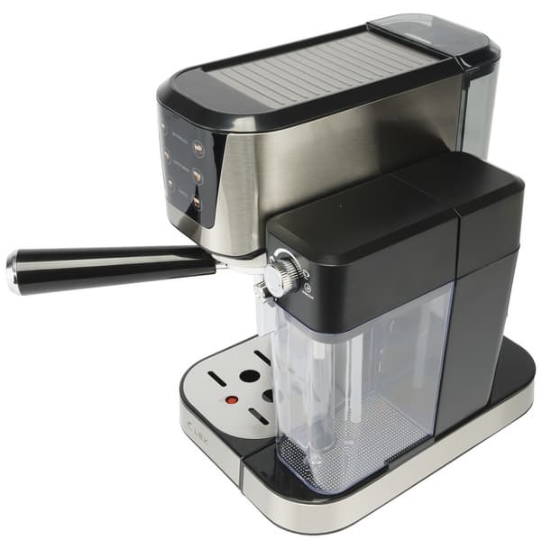 Кофеварка выглядит стильно и элегантно: ее пластиковый корпус оформлен металлическими вставками на передней панели и в зоне автоподогрева. На лицевой стороне размещена панель управления, а на крышке молочного резервуара — регулятор подачи молока.