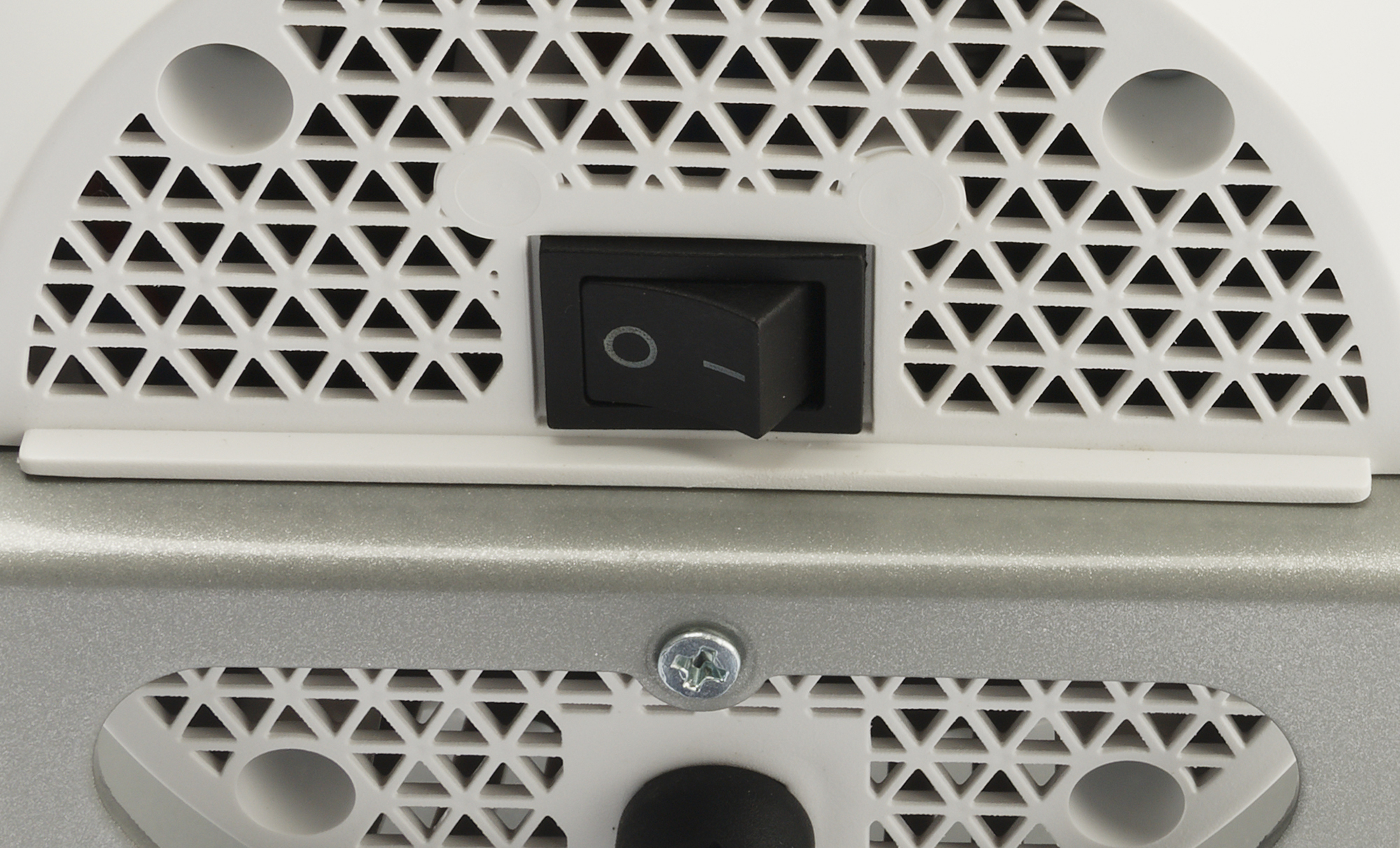 Корпус прибора выполнен из белого пластика. Спереди мы видим декоративную накладку-ободок из пластика, окрашенного под металл. Решетка выхода воздуха — металлическая, окрашенная в черный цвет.