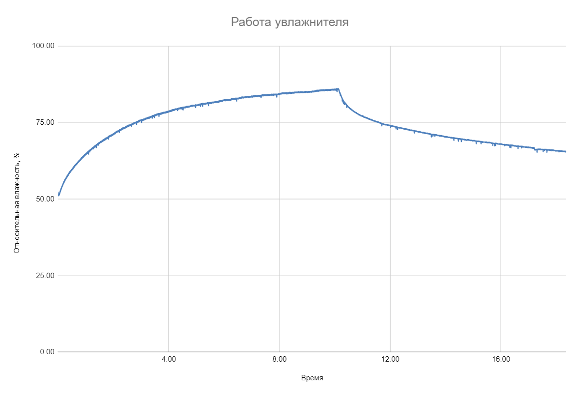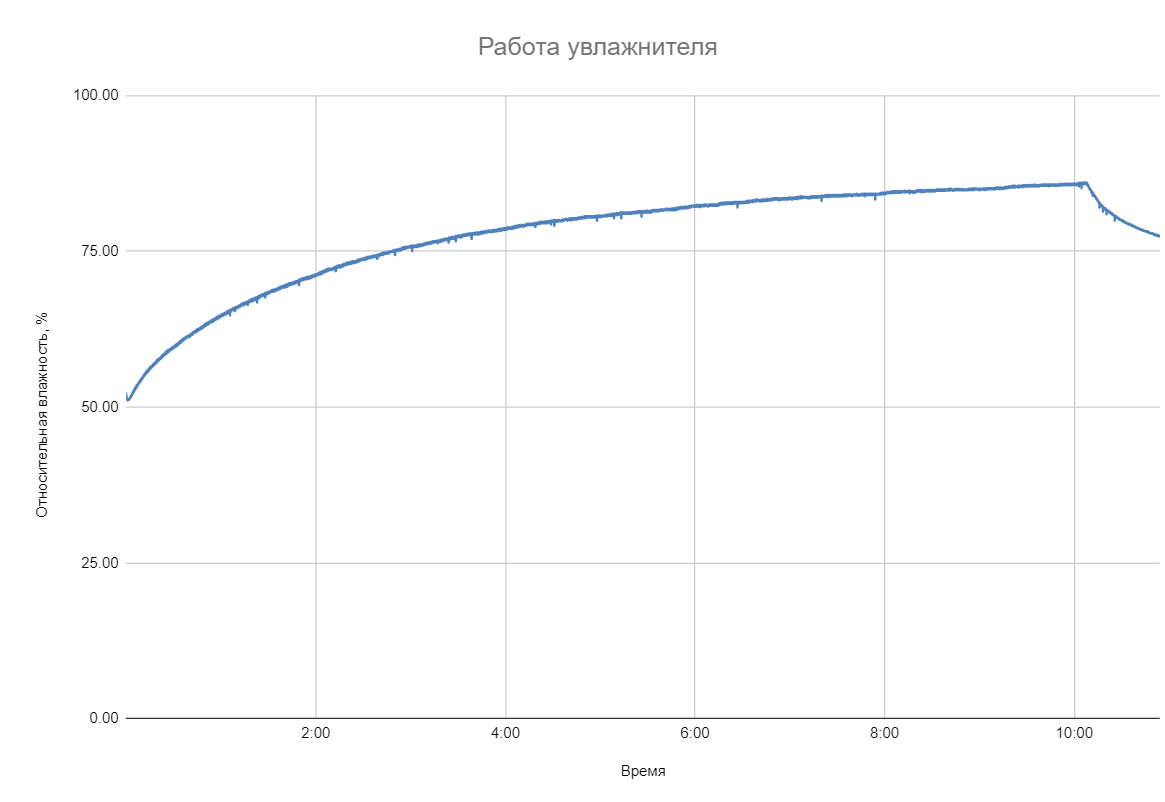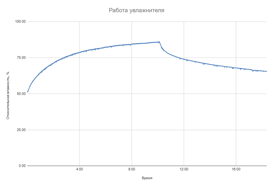 Начав работать в помещении с относительной влажностью равной около 51%, прибор увлажнял воздух в течении чуть более, чем 10 часов, постепенно подняв относительную влажность до 86%. После этого вода в баке закончилась и влажность начала постепенно снижаться.