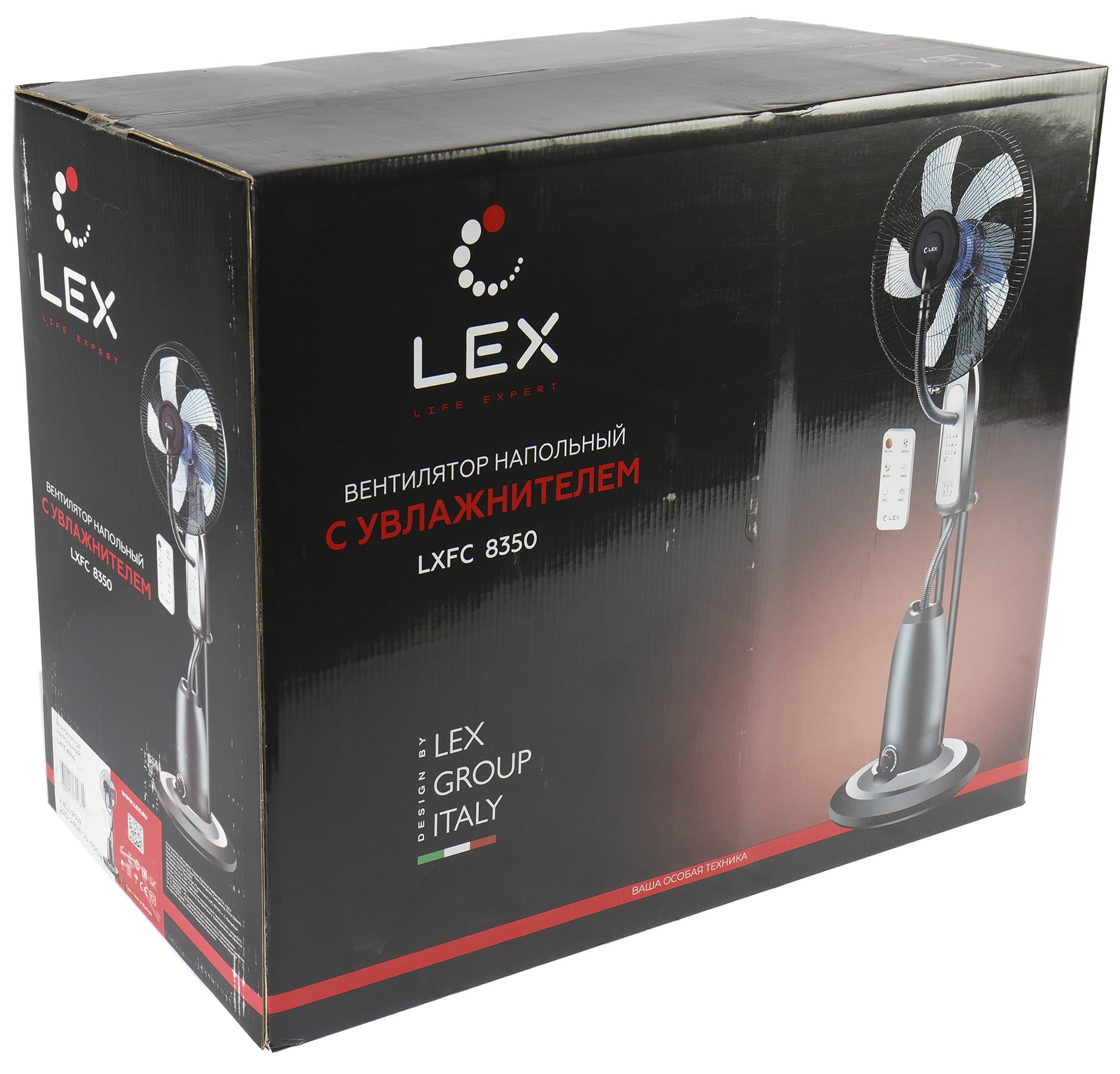 На боковых гранях приведены технические характеристики и основные особенности модели: диаметр лопастей Lex LXFC 8350 составляет 40 сантиметров, мощность — 90 Вт, у вентилятора три скорости вращения, есть механизм автоматического поворота корпуса, защита от перегрева и дистанционное управление, и, конечно же, режим увлажнения.