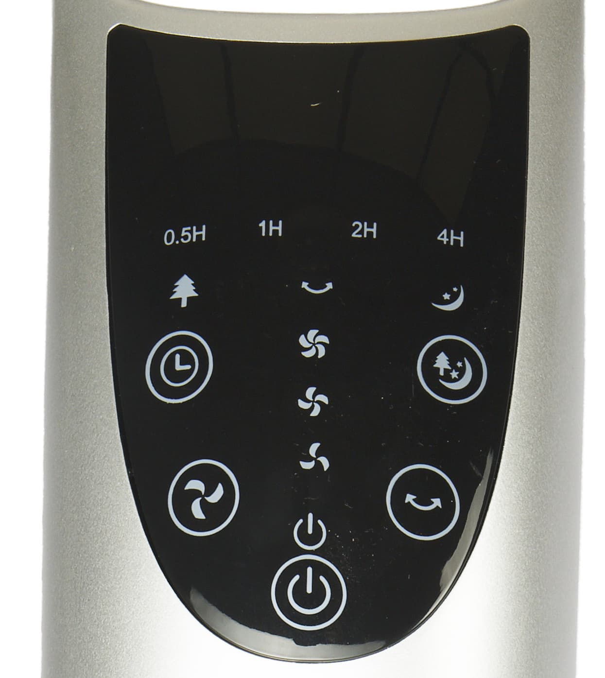 Панель управления вентилятором выполнена из гладкого пластика темного цвета. В нижней части расположены пять сенсорных кнопок. Индикаторы в центральной и верхней части обозначают режимы работы устройства. Это красные светодиоды, подсвечивающие соответствующие символы.