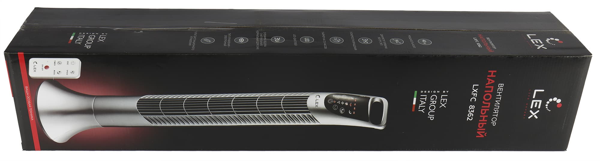 Вентилятор Lex LXFC 8362 упакован в продолговатую черно-красную коробку из глянцевого картона, оформленную в фирменном стиле производителя. Лицевую сторону занимает фотография работающего прибора, а рядом с ней изображен пульт управления.