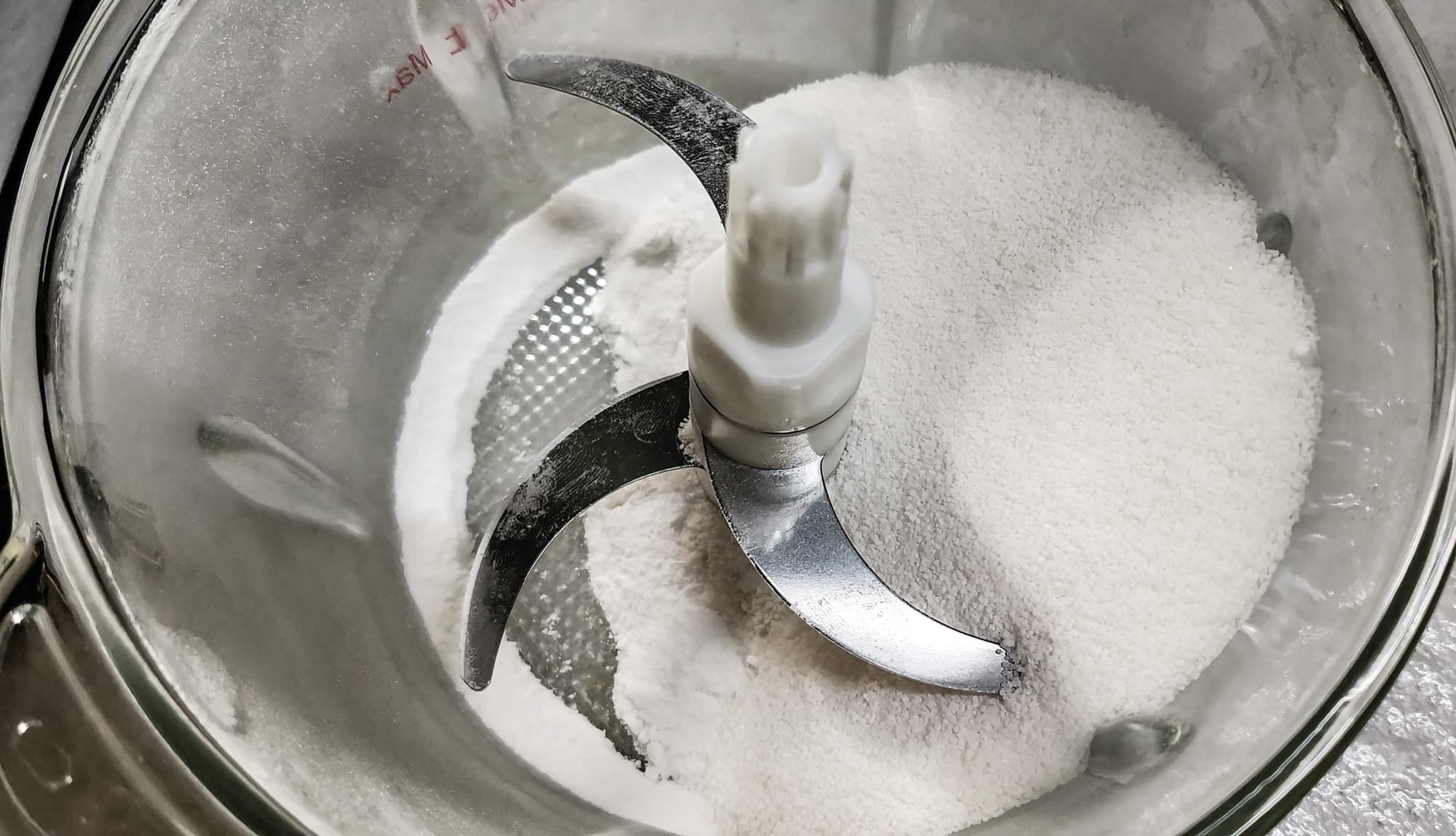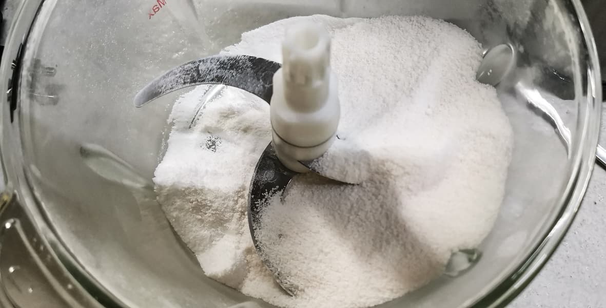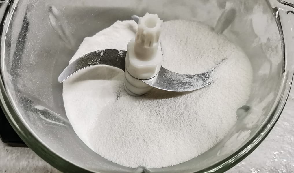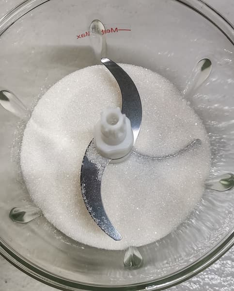 В измельчитель засыпали 300 г сахара, измельчали на максимальных оборотах 15 секунд, затем после паузы еще 15 секунд.