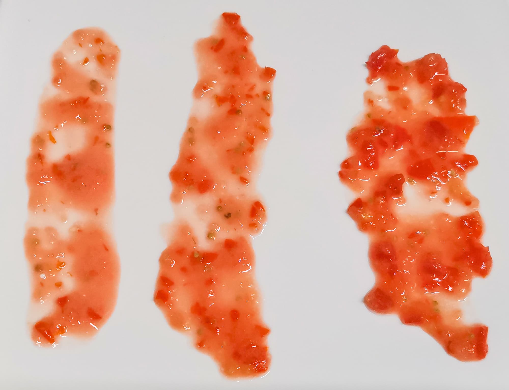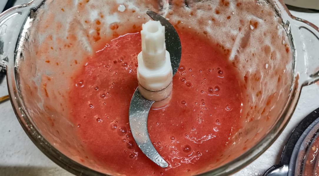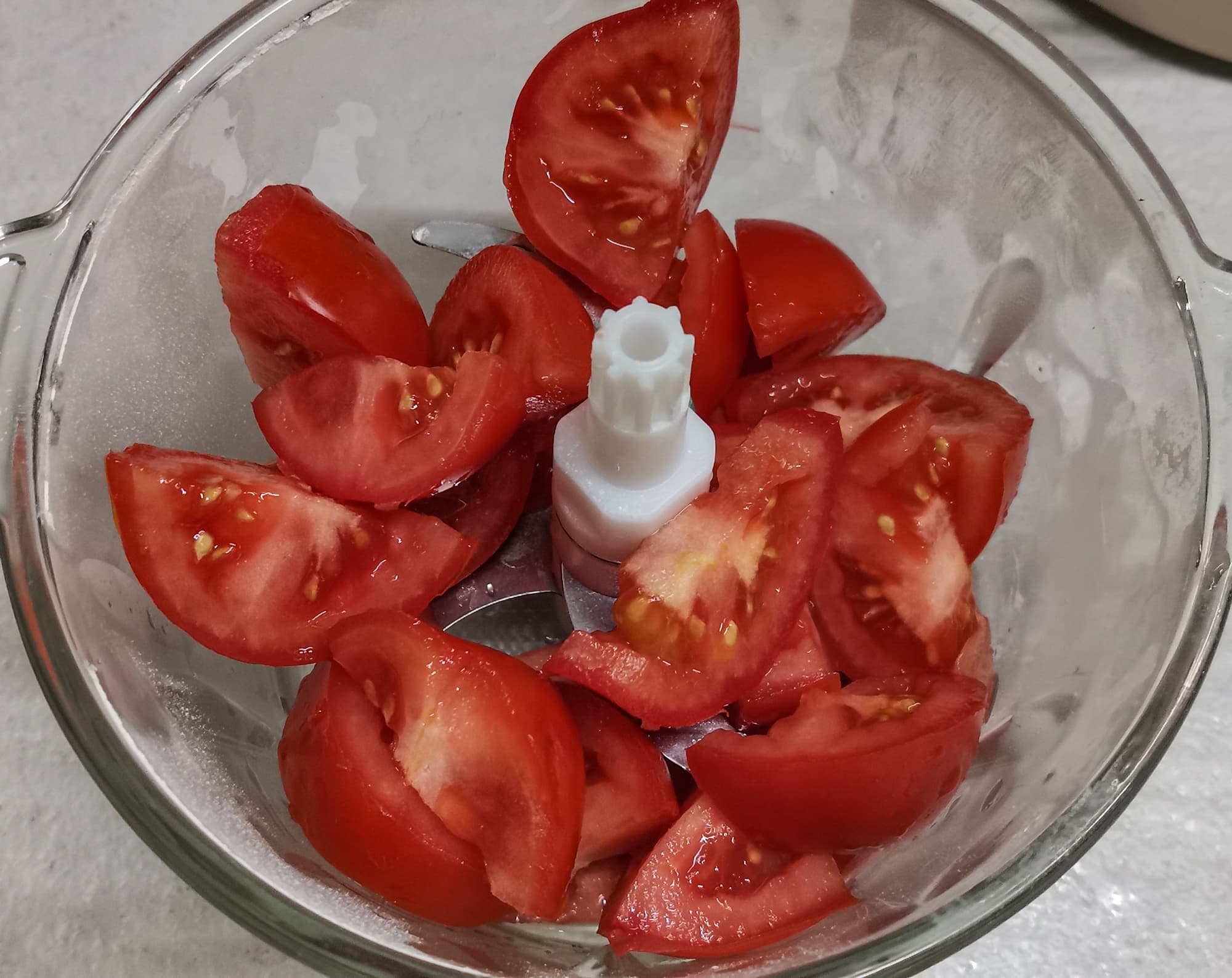 Измельчали циклами по 15 секунд с паузой между ними. Томаты сразу подхватились ножами, и уже после первого цикла мы имели однородную массу с включениями семян и крупно порезанной кожицы.