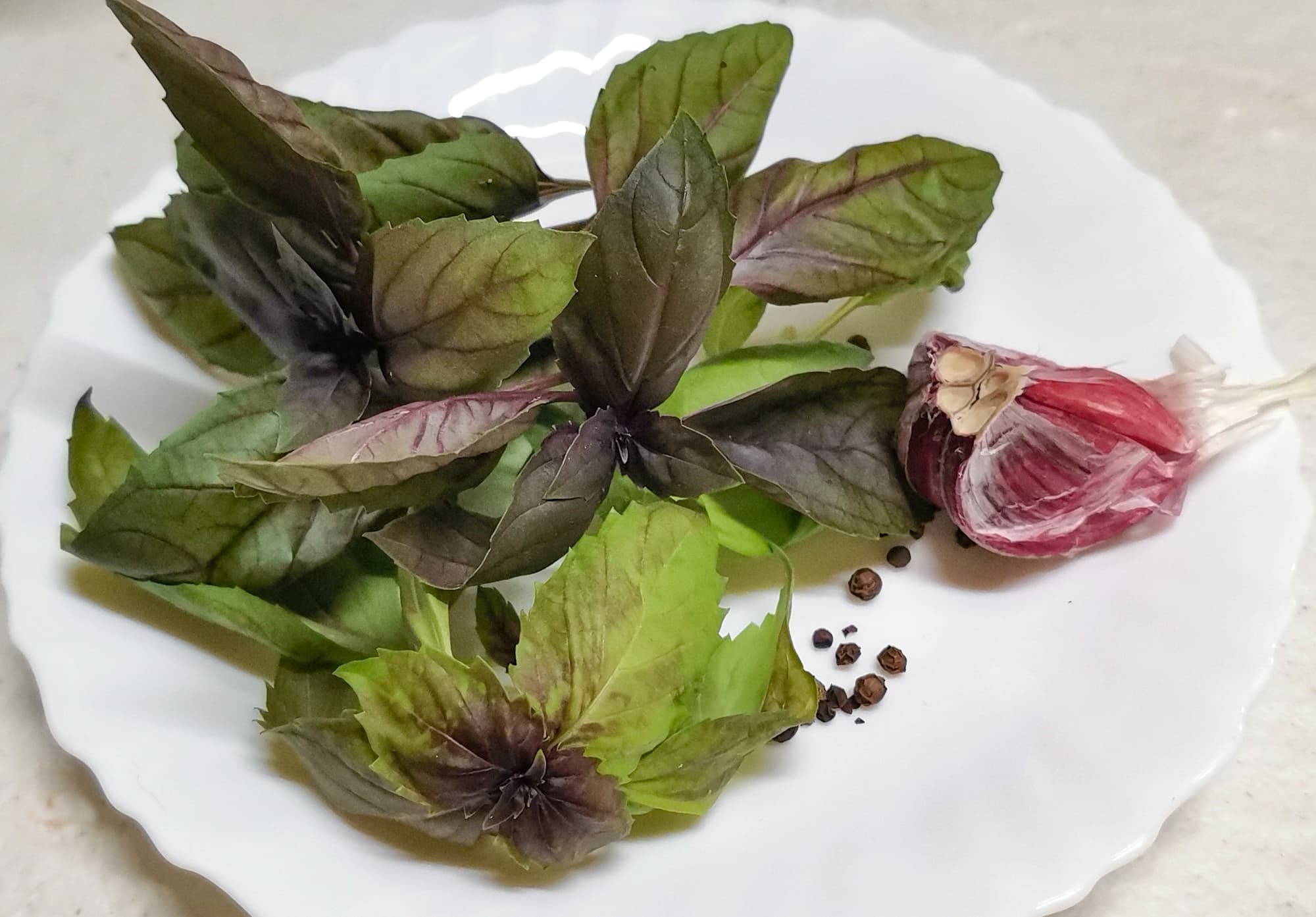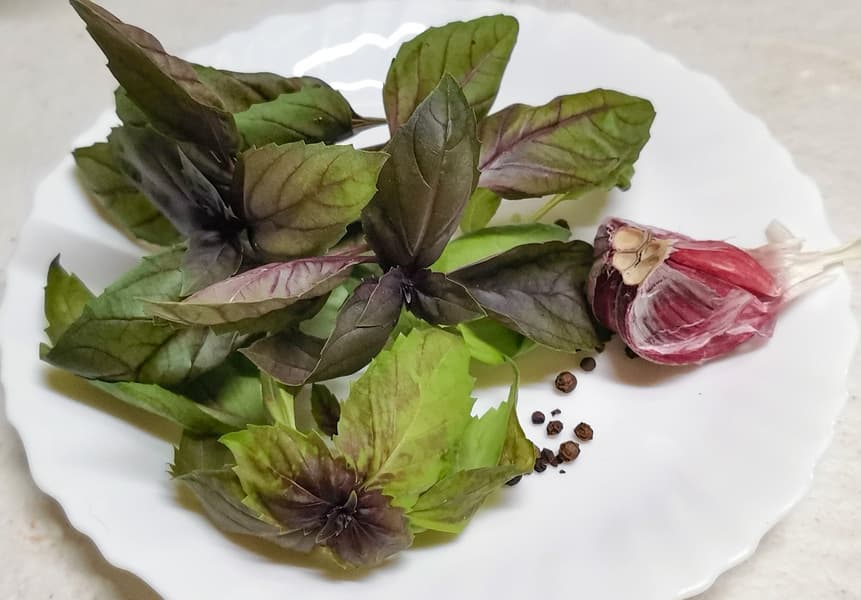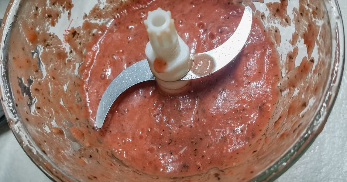 К томатной смеси мы добавили свежий базилик, чеснок, соль, молотый острый перец, паприку и оливковое масло. Прокрутили еще два раза по 15 секунд.