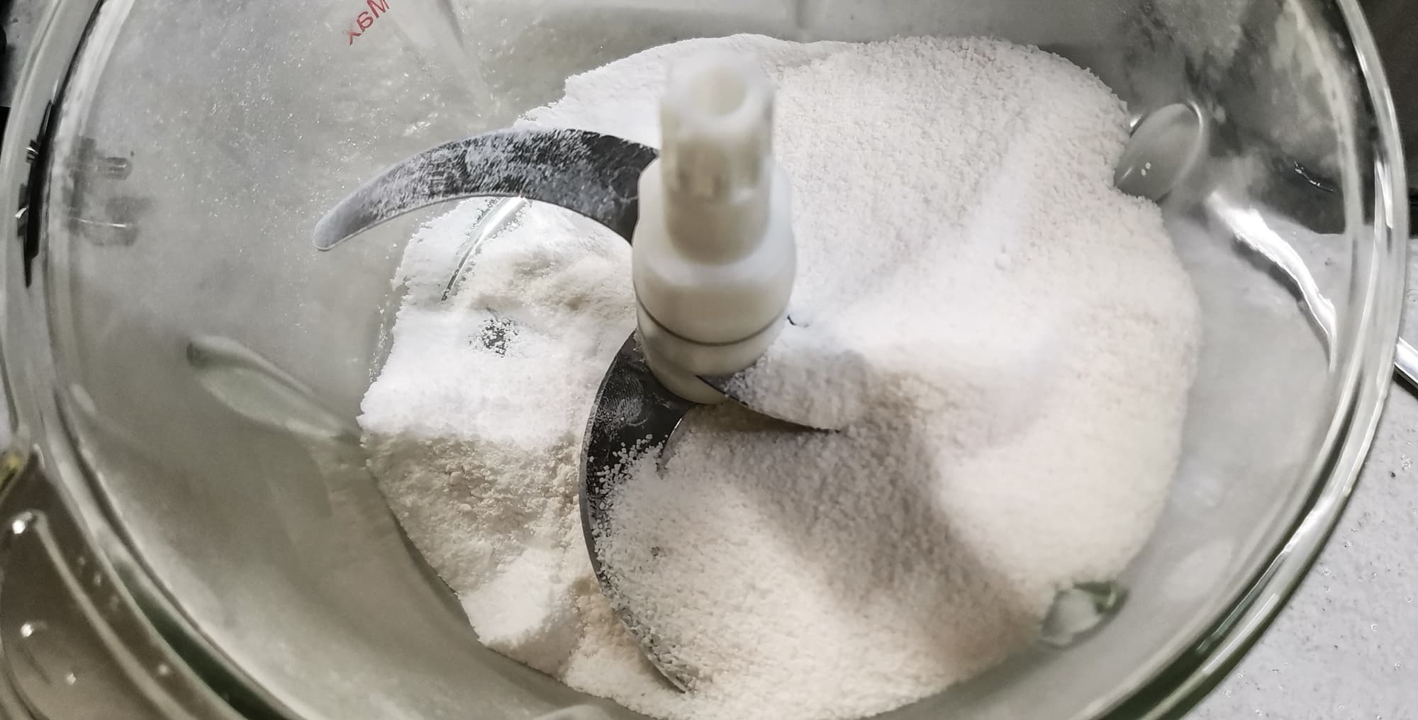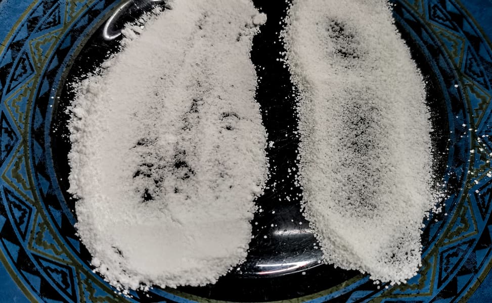 Вот что получилось. Справа результат после двух циклов измельчения, слева — после восьми. Сахар частично дробится в пудру, но крупной фракции все равно больше половины. В принципе, можно просеять этот сахар через сито и разделить мелкую и крупную фракцию, но с такими трудозатратами гораздо проще намолоть пудры в кофемолке маленькими порциями.
