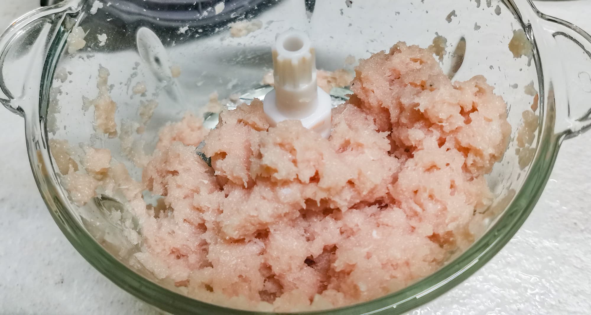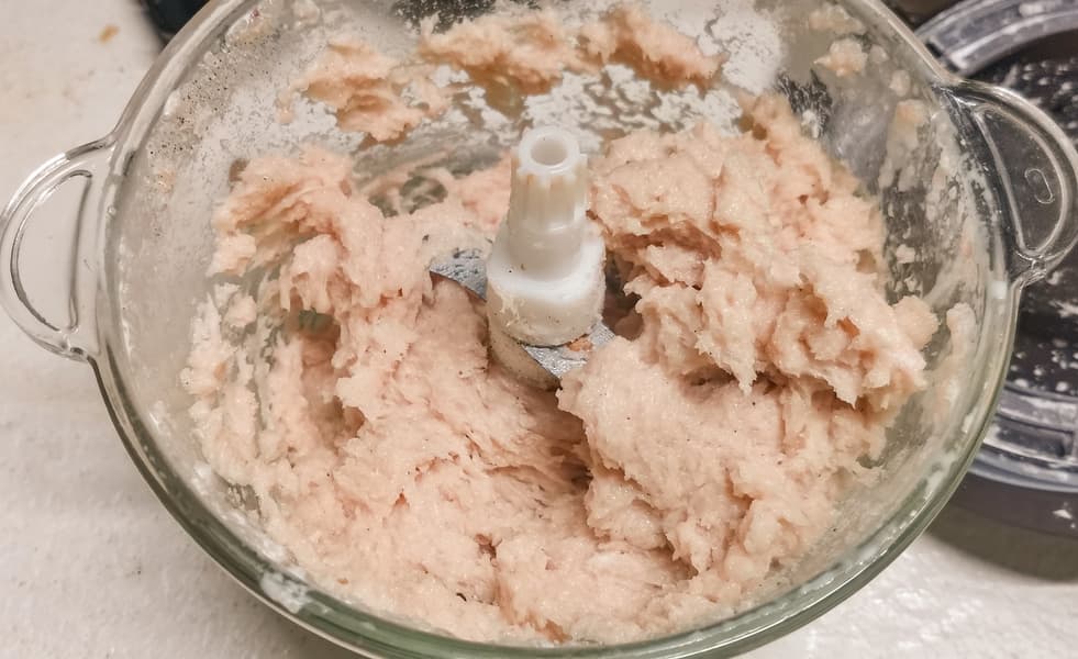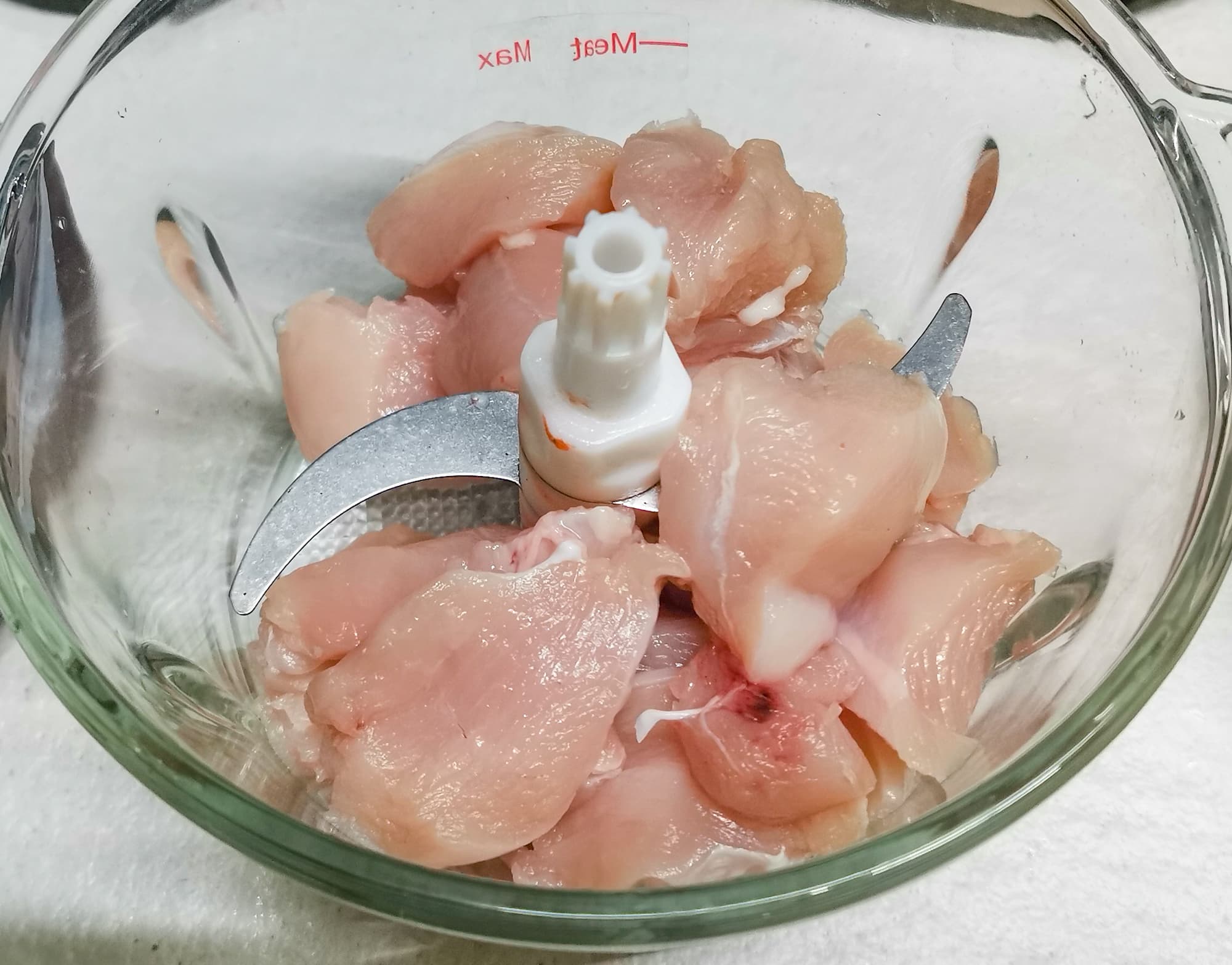 Мы взяли куриную грудку, нарезали крупными кусками, положили в емкость около 400 г и измельчали в течение 15 секунд.