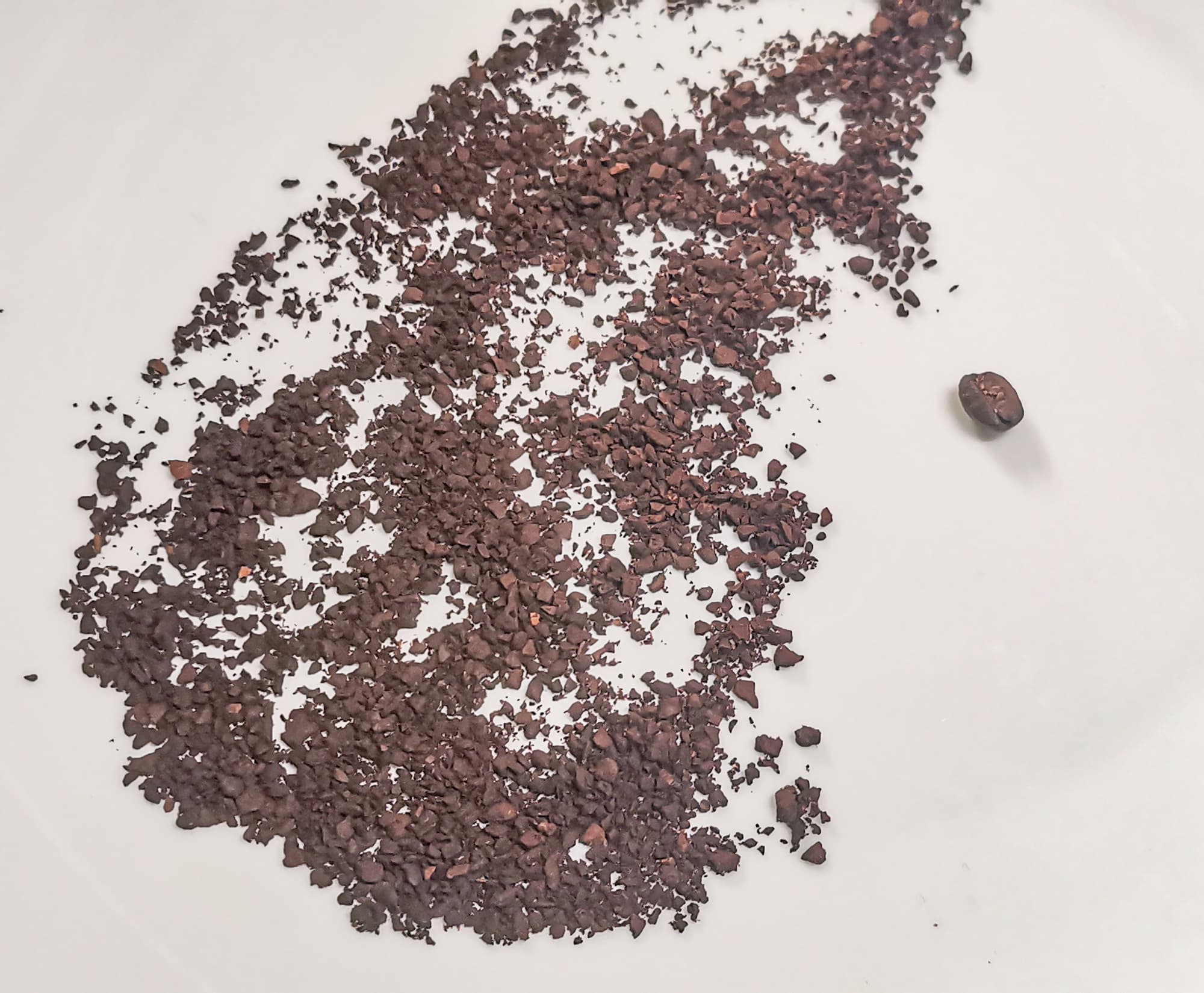 Зерно сфотографировано рядом с молотым кофе для понимания масштаба получившейся фракции после 6 циклов измельчения. Такой помол подойдет разве что для френч-пресса, для всех остальных способов заваривания кофе он явно крупноват.