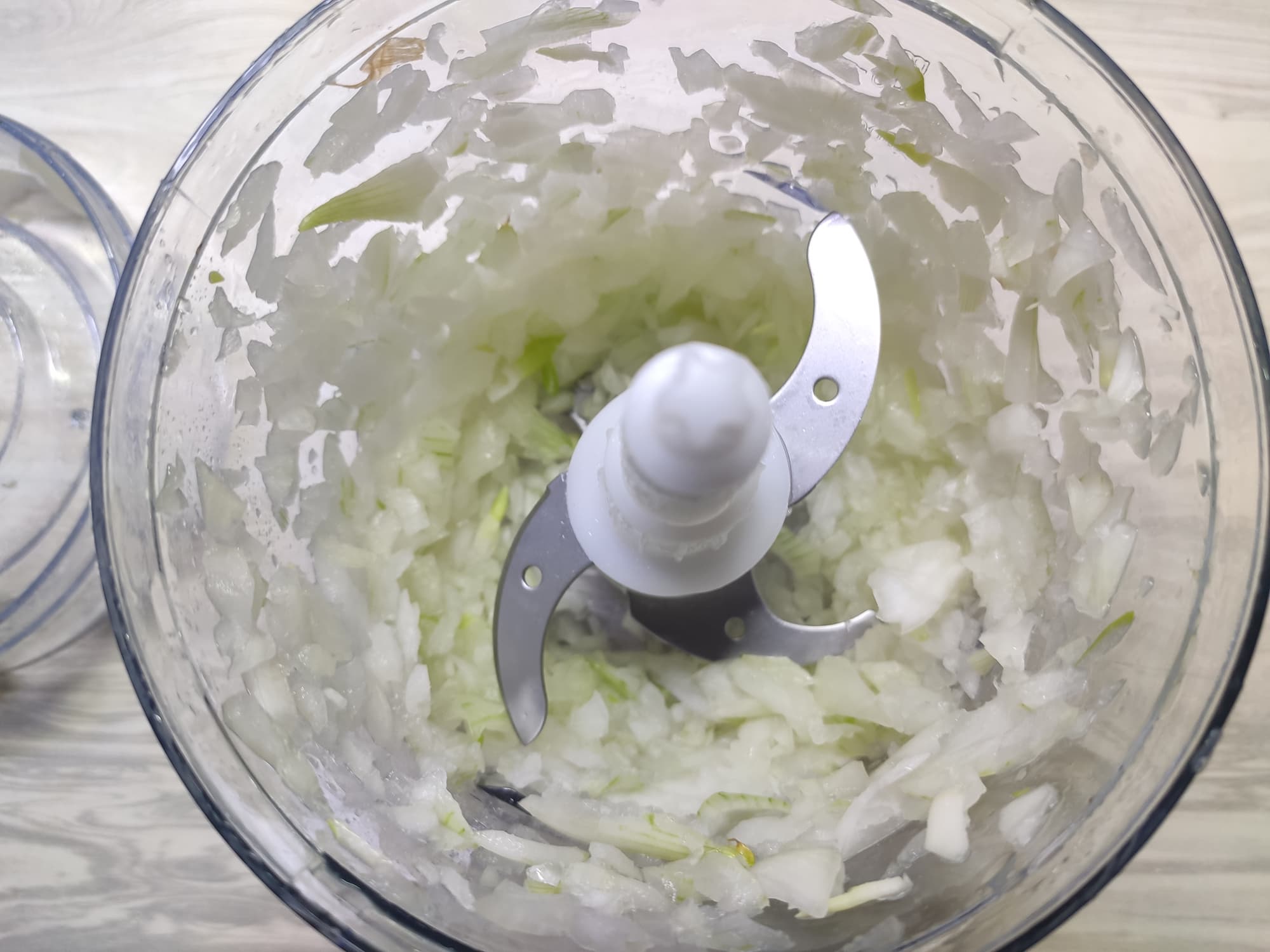 Всего 10 секунд — и лук оказался нарезан (измельчен) до более-менее однородного состояния.