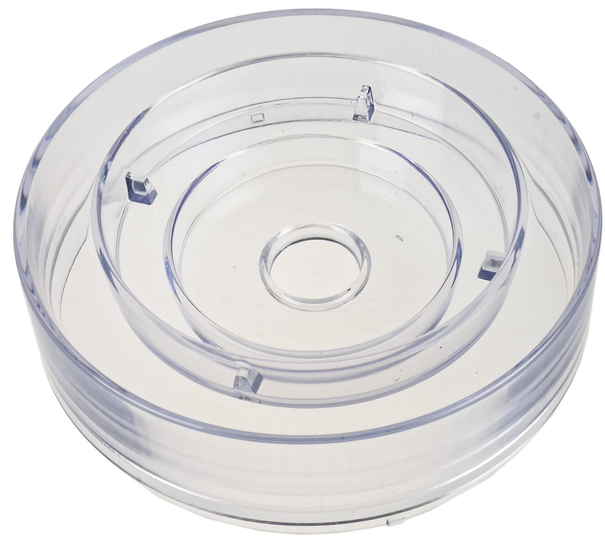 Защита моторного блока (и окружающего пространства) от брызг осуществляется с помощью пластиковой крышки. По центру крышки расположено отверстие для стыковки ножей с моторным блоком, так что использовать чашу для длительного хранения измельченных продуктов вряд ли получится.
