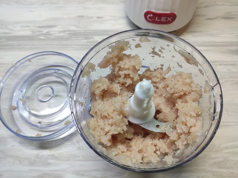 Нужны более мелкие кусочки? Вооружаемся силиконовой лопаткой, собираем весь лук на дно чаши и запускаем измельчение еще не 5-10 секунд.