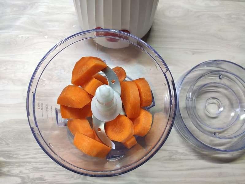 Морковь была очищена и нарезана толстыми кусочками-кружочками, после чего помещена в чашу для измельчения.