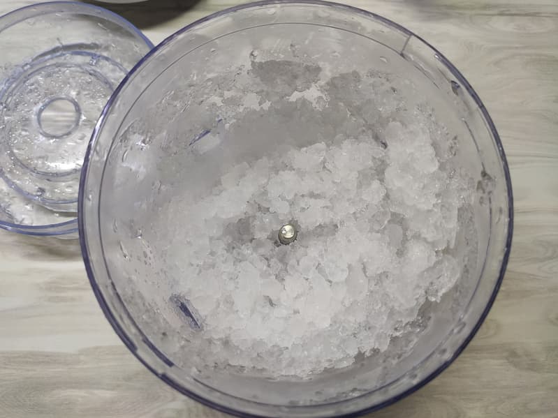Усложним задачу и добавим еще примерно такой же объем льда. Результат — снова равномерная крошка без вкраплений крупных частиц.