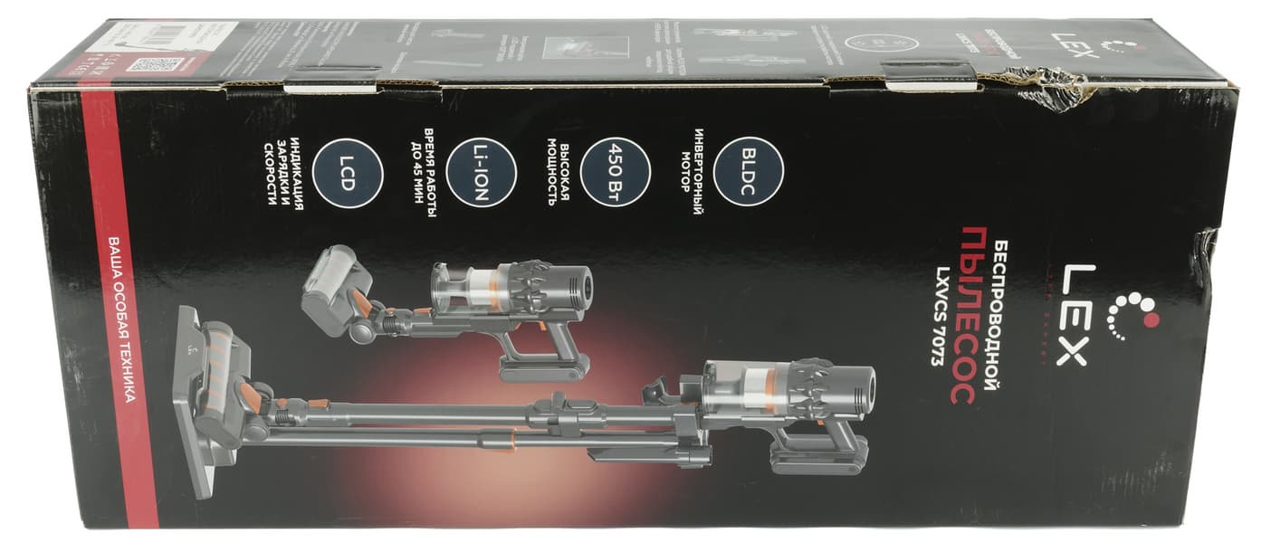 Пылесос поставляется в картонной коробке с полноцветной печатью. На передней стороне производитель разместил две фотографии устройства: в конфигурациях для пола и ручной уборки. Здесь же приведены основные характеристики модели: инверторный бесщеточный (BLDC) двигатель с потребляемой мощностью 450 Вт, литий-ионный аккумулятор, обеспечивающий до 45 минут непрерывной работы, и жидкокристаллический (LCD) индикатор зарядки и скорости.