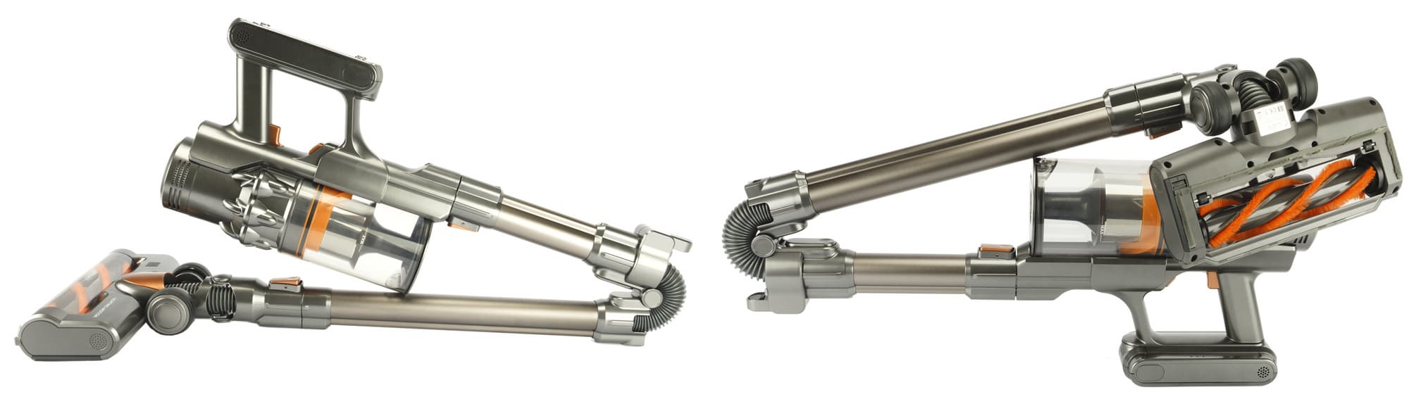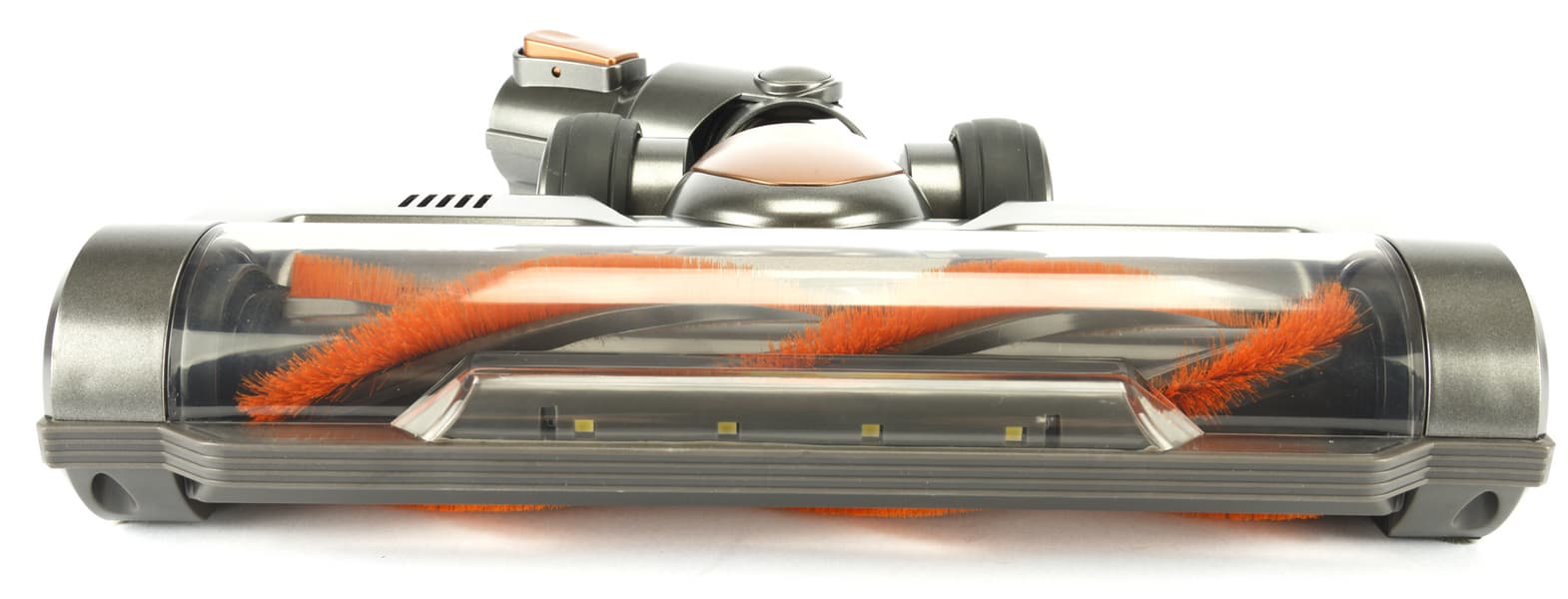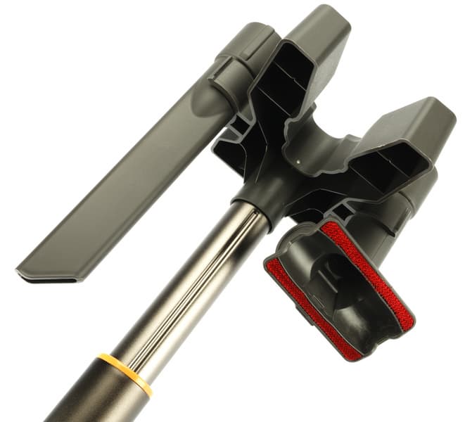 Конструкция корпуса моторного блока и щетки для пола позволяет наводить порядок в труднодоступных местах под диванами и шкафами на всю длину трубки. Благодаря небольшой высоте этой части устройство помогает собрать пыль даже между не слишком высокими мебельными ножками.