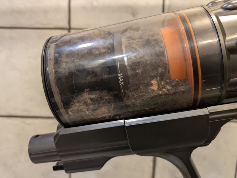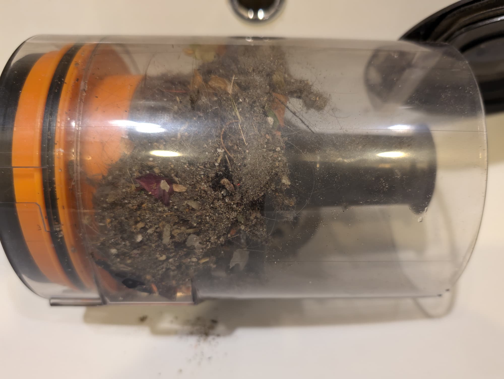 Прозрачный корпус мусоросборника позволяет легко контролировать заполнение резервуара. Отметим хорошее качество пластика: после нескольких интенсивных уборок мы не наблюдаем характерного помутнения внутренней поверхности, вызываемого вращением в циклоне твердых частиц.