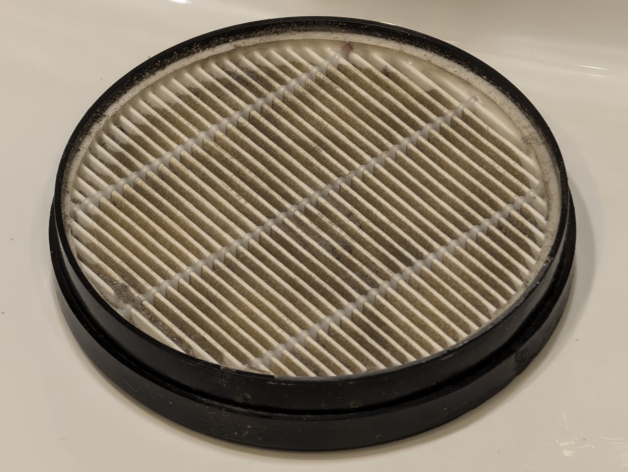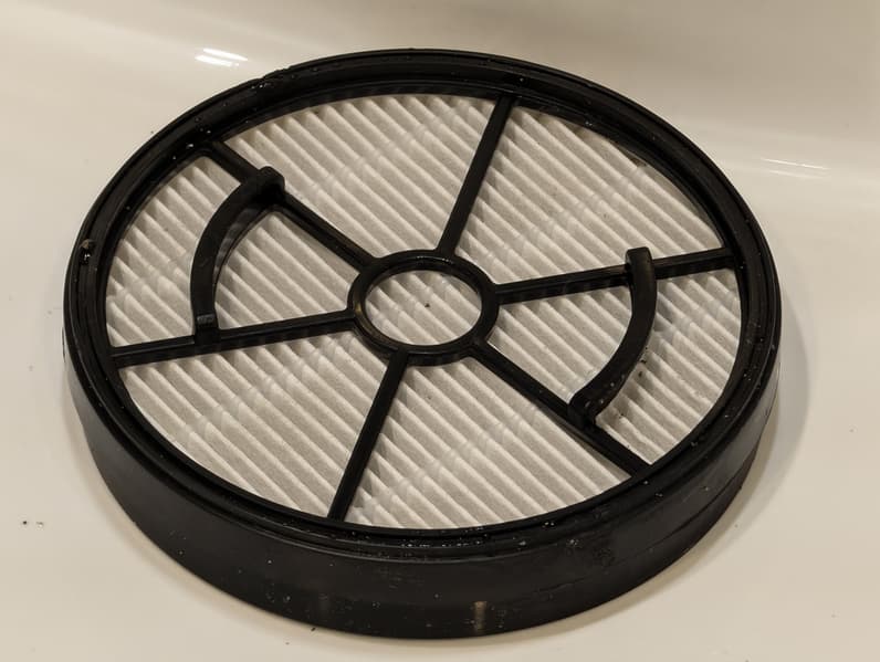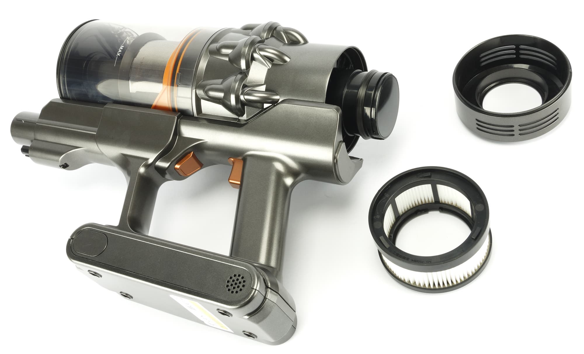 Выпускной фильтр представляет собой цилиндрический HEPA-элемент, установленный в задней части моторного блока под пластиковой крышкой.