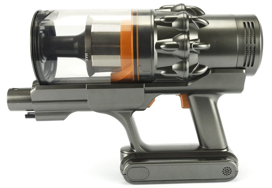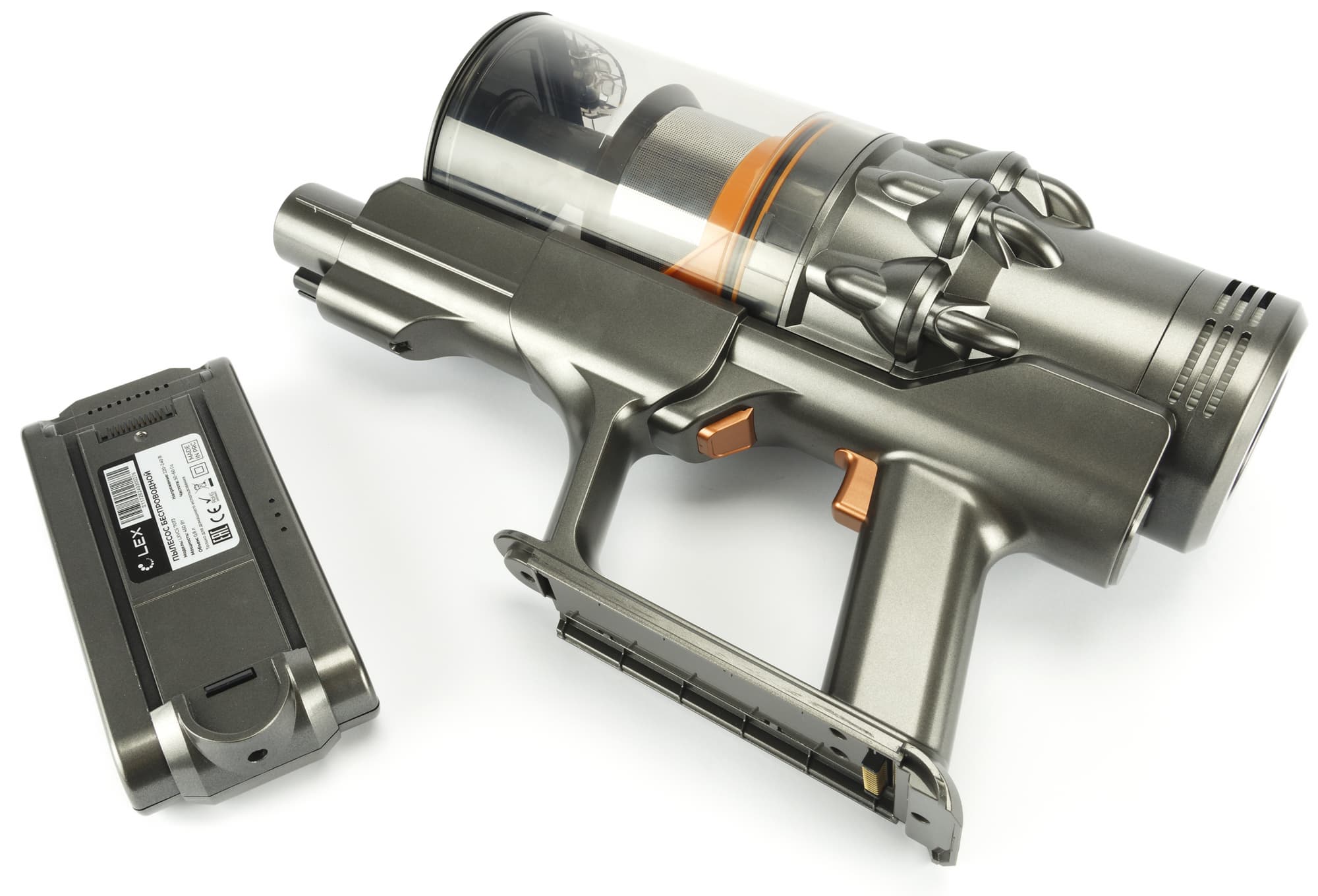 У Lex LXVCS 7073 продольная компоновка: цилиндрический контейнер с циклонным фильтром расположен параллельно воздушному тракту. За контейнером размещен BLDC-двигатель, после которого воздух попадает в выпускной HEPA-фильтр.