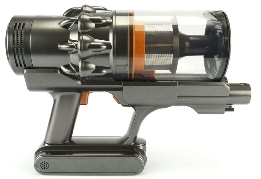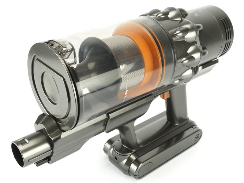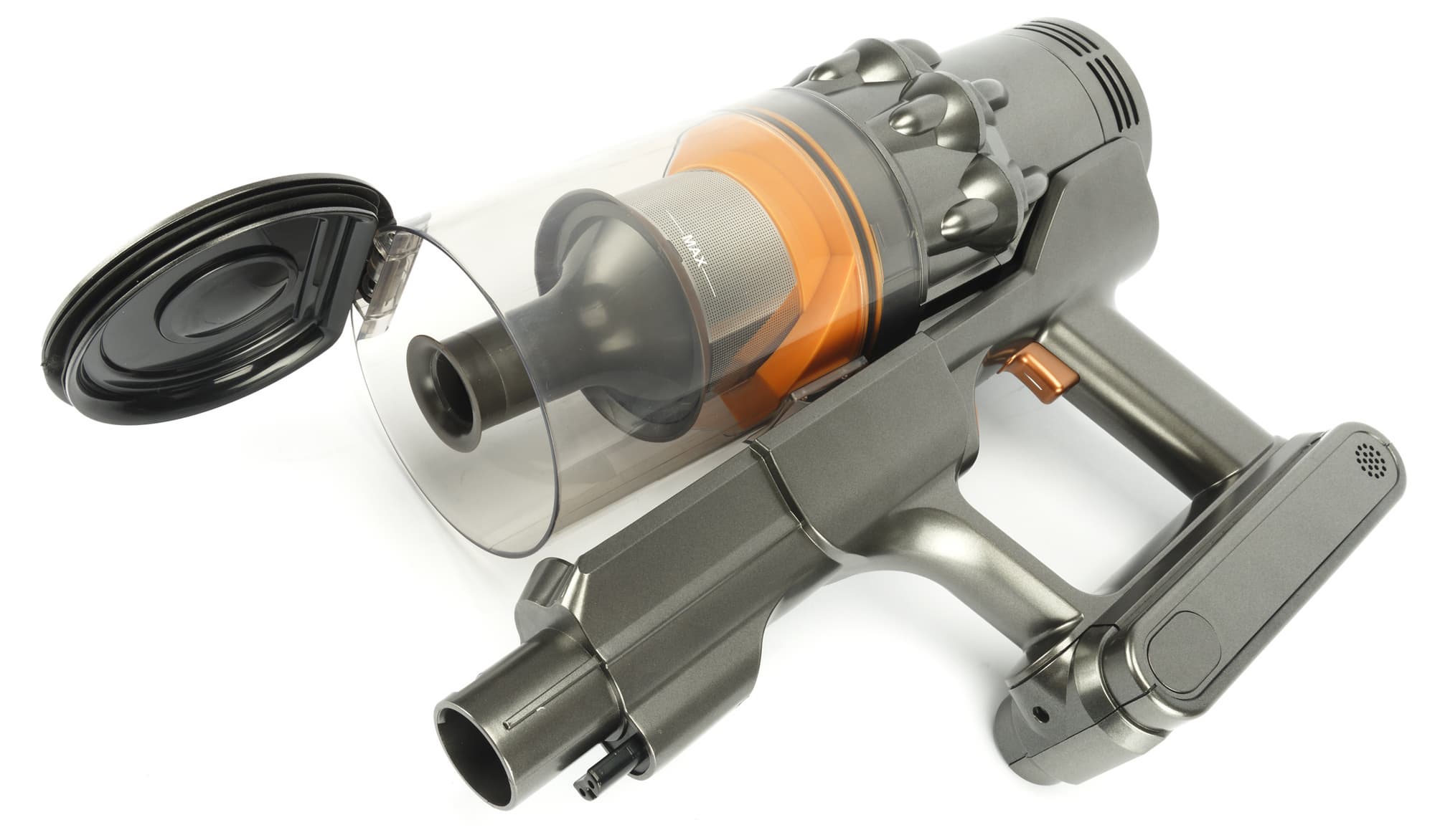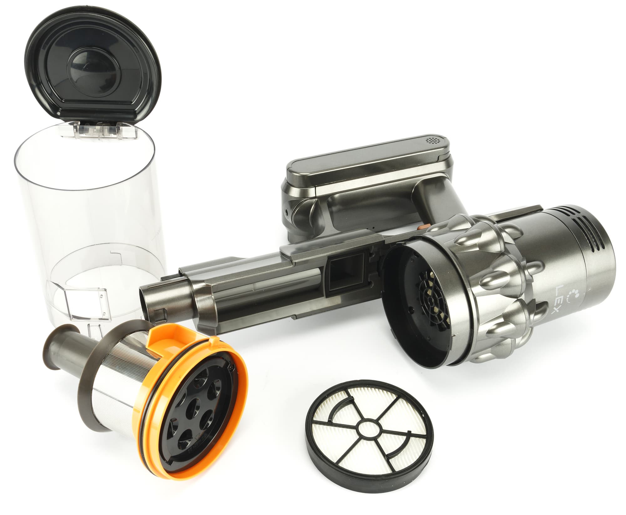 Поток воздуха с мусором и пылью из воздушного тракта разворачивается на 180° и попадает в контейнер, где закручивается вокруг центрального циклонного элемента. Крупные и тяжелые частицы отбрасываются «юбкой» циклона и оседают на дне пластикового цилиндра, а среднего размера мусор сепарируется с помощью стальной сетки с микроперфорацией. Мелкая пыль задерживается на дисковом HEPA-элементе, отвечающем за тонкую очистку.